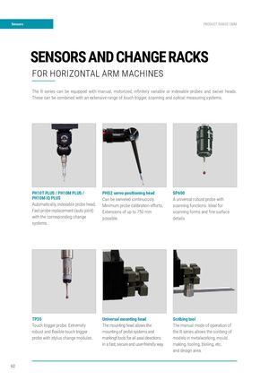 eSxeanCsTor®sM PRODUCT RANGE CMM SENSORS AND CHANGE RACKS FOR HORIZONTAL ARM MACHINES The R series can be equipped with manual, motorized, infinitely variable or indexable probes and swivel heads. These can be combined with an extensive range of touch trigger, scanning and optical measuring systems. PH10T PLUS / PH10M PLUS / PHS2 servo positioning head SP600 PH10M iQ PLUS Can be swiveled continuously. A universal robust probe with Automatically, indexable probe head, Minimum probe calibration efforts. scanning functions. Ideal for Fast probe replacement (auto joint) Extensions of up to 750 mm scanning forms and fine surface with the corresponding change possible. details. systems. TP20 Universal mounting head Scribing tool Touch trigger probe. Extremely The mounting head allows the The manual mode of operation of robust and flexible touch trigger mounting of probe systems and the R series allows the scribing of probe with stylus change modules. markingt tools for all axial directions models in metalworking, mould in a fast, secure and user-friendly way. making, tooling, tooling, etc. and design area. 5602