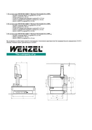 1: В соответствии DIN EN ISO 10360-2 / Maximum Permissible Error MPEP • SP25M с модулем SM25-1 и щупом Ø 4 x 21 mm • SP80 и щупом Ø 5 x 50 mm • TP200 со стандартным модулем и щупом Ø 4 x 21 mm • TP20 со стандартным модулем и щупом Ø 4 x 10 mm • REVO с RSP3-3 и щупом Ø 4 x 21 mm 2: В соответствии DIN EN ISO 10360-2 / Maximum Permissible Error MPEE • SP25M с модулем SM25-1 и щупом Ø 4 x 21 mm • SP80 и щупом Ø 5 x 50 mm • TP200 со стандартным модулем и щупом Ø 4 x 21 mm • TP20 со стандартным модулем и щупом Ø 4 x 21 mm • REVO с RSP3-3 и щупом Ø 4 x 21 mm 3: В соответствии DIN EN ISO 10360-4 / Maximum Permissible Error MPETHP • SP25M с модулем SM25-1 и щупом Ø 4 x 21 mm • SP80 и щупом Ø 5 x 50 mm • REVO с RSP3-3 и щупом Ø 4 x 21 mm Мы оставляем за собой право изменять конструкцию и технические характеристики без предварительного уведомления. © 2014 WENZEL Präzision GmbH, действительно с 07/2014