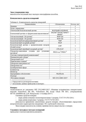 Лист № 8 Всего листов 9 Знак утверждения типа наносится на титульный лист паспорта типографским способом. Комплектность средства измерений Таблица 6 - Комплектность средства измерений Наименование Обозначение Кол-во, шт. Машина - 1 Пульт управления - 1 Оптический бесконтактный датчик WZ/TO/IP110T/IP40T 1 Контактный датчик со сферическим наконечником1 SP25M2)/TP2002)/SP802)/SP6002)1 Оптоволоконный 2D датчик1 WFP 2D 1 Оптоволоконный 3D датчик1 WFP 3D 1 Бесконтактный интерференционный датчик1 WIP 1 Бесконтактный лазерный датчик1 WLP 1 Бесконтактный датчик с хроматическим лазером (белый лазер) 1 CFP 1 Бесконтактный линейный лазерный датчик1 CFL/LLP 1 Поворотно-наклонная головка для установкидатчиков1PH10-xxx2)/PHS12) 1 Система температурной компенсации1 - 1 Пневматические опоры1 - 1 Поворотный стол1 - 1 Парковочная станция1 - 1 Поворотно-наклонная ось1 - 1 Поворотная ось1 - 1 Калибровочная сфера - 1 Компьютер - 1 Монитор - 2 Программное обеспечение WinWerth 1 Паспорт - 1 Методика поверки МП 2512-0003-2017 1 1) Определяется договором поставки. 2) Актуальные данные приведены в паспорте. Поверка осуществляется по документу МП 2512-0003-2017 «Машины координатные измерительные моделей VideoCheck DZ HA, VideoCheck DZ, Scope Check FB DZ», утвержденному ФГУП «ВНИИМ им. Д.И. Менделеева» 13 ноября 2017 г. Основные средства поверки: - меры длины концевые плоскопараллельные 3 разряда, ГОСТ Р 8.763-2011; - меры длины штриховые 3 разряда, ГОСТ Р 8.763-2011. Допускается применение аналогичных средств поверки, обеспечивающих определение метрологических характеристик поверяемых СИ с требуемой точностью. Знак поверки наносится на станину машины или на свидетельство о поверке. Сведения о методиках (методах) измерений приведены в эксплуатационном документе.