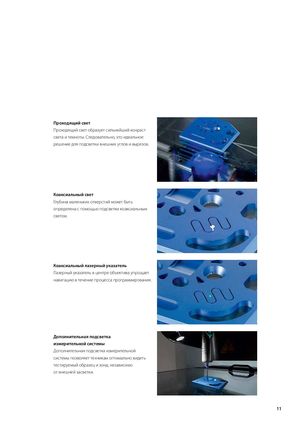 Проходящий свет Проходящий свет образует сильнейший конраст света и темноты. Следовательно, это идеальное решение для подсветки внешних углов и вырезов. Коаксиальный свет Глубина маленьких отверстий может быть определена с помощью подсветки коаксиальным светом. Коаксиальный лазерный указатель Лазерный указатель в центре объектива упрощает навигацию в течение процесса программирования. Дополнительная подсветка измерительной системы Дополнительная подсветка измерительной системы позволяет техникам оптимально видеть тестируемый образец и зонд, независимо от внешней засветки. 11