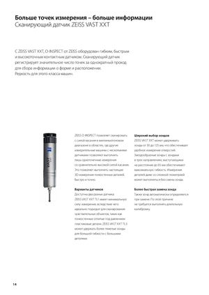 Больше точек измерения – больше информации Сканирующий датчик ZEISS VAST XXT С ZEISS VAST XXT, O-INSPECT от ZEISS оборудован гибким, быстрым и высокоточным контактным датчиком. Сканирующий датчик регистрирует значительное число точек за однократный проход для сбора информации о форме и расположении. Редкость для этого класса машин. ZEISS O-INSPECT позволяет сканировать Широкий выбор зондов с силой касания в миллиньютоновом ZEISS VAST XXT может удерживать диапазоне в областях, где другие зонды от 30 до 125 мм, что обеспечивает измерительные машины с несколькими удобное измерение отверстий. датчиками позволяют выполнять Звездообразные зонды с зондами лишь одноточечные измерения в трех направлениях, выступающими со сравнительно высокой силой касания. на расстояние до 65 мм обеспечивают Это позволяет выполнять настоящие максимальную гибкость. Измерения 3D-измерения тонкостенных деталей. деталей даже со сложной геометрией Быстро и точно. может выполняться без смены зонда. Варианты датчиков Более быстрая замена зонда Доступны два разных датчика: Также зонд автоматически определяется ZEISS VAST XXT TL1 имеет минимальную при замене. По этой причине силу измерения, вследствие чего не требуется выполнять длительную идеально подходит для сканирования калибровку. чувствительных объектов, таких как тонкостенные отлитые под давлением пластиковые детали. ZEISS VAST XXT TL3 может удержать более тяжелые зонды для большей гибкости с большими деталями. 14