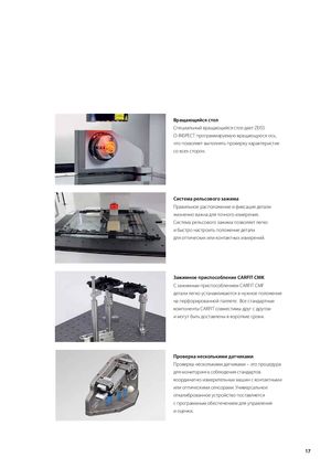 Вращающийся стол Специальный вращающийся стол дает ZEISS O-INSPECT программируемую вращающуюся ось, что позволяет выполнять проверку характеристик со всех сторон. Система рельсового зажима Правильное расположение и фиксация детали жизненно важна для точного измерения. Система рельсового зажима позволяет легко и быстро настроить положение детали для оптических или контактных измерений. Зажимное приспособление CARFIT CMK C зажимным приспособлением CARFIT CMF детали легко устанавливаются в нужное положение на перфорированной паллете. Все стандартные компоненты CARFIT совместимы друг с другом и могут быть доставлены в короткие сроки. Проверка несколькими датчиками Проверка несколькими датчиками – это процедура для мониторинга соблюдения стандартов координатно-измерительных машин с контактными или оптическими сенсорами. Универсальное откалиброванное устройство поставляется с программным обеспечением для управления и оценки. 17