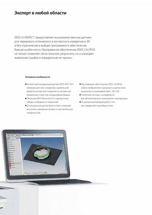 Эксперт в любой области ZEISS O-INSPECT предоставляет высококачественные датчики для передового оптического и контактного измерения в 3D и без ограничения в выборе программного обеспечения. Важная особенность: Программное обеспечение ZEISS CALYPSO не только позволяет легко получить результаты, но и упрощает выявление ошибок и определение их причин. Основные особенности Контактный сканирующий датчик ZEISS VAST XXT: Программное обеспечение ZEISS CALYPSO: минимальная сила измерения, наименьший живое изображение и результат в одном окне, диаметр контактной поверхности, множество возможность взаимодействия с 3D CAD измеренных точек при сканировании формы Паллетная система с интерфейсом Объектив ZEISS Discovery.V12: широкая зона для автоматического мониторинга температуры обзора, свободная от искажений Опциональный вращающийся стол Опциональный датчик белого света позволяет для измерений под любым углом выполнять измерение мелких и чувствительных поверхностей 7