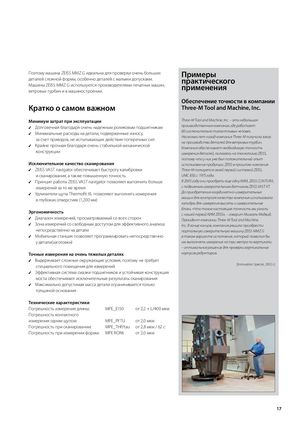 Поэтому машина ZEISS MMZ G идеальна для проверки очень больших Примеры деталей сложной формы, особенно деталей с малыми допусками. практического Машины ZEISS MMZ G используются производителями печатных машин,ветровых турбин и в машиностроении.применения Обеспечение точности в компании Кратко о самом важном Three-M Tool and Machine, Inc. Минимум затрат при эксплуатации Three-M Tool and Machine, Inc. – это небольшая Долговечная благодаря очень надежным роликовым подшипникам производственная компания, где работают Минимальные расходы на детали, подверженные износу, 80 исключительно талантливых человек. за счет приводов, не испытывающих действия поперечных сил Несколько лет назад компания Three-M получила заказ на производство деталей для ветровых турбин. Крайне прочная благодаря очень стабильной механической Компания обеспечивает необходимую точность конструкции измерения деталей, полагаясь на технологию ZEISS, потому что у них уже был положительный опыт Исключительное качество сканирования использования продукции ZEISS в прошлом: компания ZEISS VAST navigator обеспечивает быстроту калибровки Three-M пользуется своей первой системой ZEISS, и сканирования, а также повышенную точность UMC 850, с 1975 года. Принцип работы ZEISS VAST navigator позволяет выполнить больше В 2005 году они приобрели еще одну КИМ, ZEISS CONTURA, измерений за то же время с подвижным измерительным датчиком ZEISS VAST XT. Удлинители щупа Thermofit XL позволяют выполнять измерения До приобретения координатно-измерительных в глубоких отверстиях (1,200 мм) машин для контроля качества компания использовала калибры для измерения высоты и измерительные блоки. «Что такое настоящая точность мы узнали Эргономичность с нашей первой КИМ ZEISS», – говорит Михаэль Медвид, Диапазон измерений, просматриваемый со всех сторон Президент компании Three-M Tool and Machine, Зона измерений со свободным доступом для эффективного анализа Inc. В конце концов, компания решила приобрести непосредственно на детали портальную измерительную машину ZEISS MMZ G Мобильная станция позволяет программировать непосредственно в таком варианте исполнения, который позволил бы у детали(заготовки) им выполнять измерения на три метра по вертикали – оптимальное решение для проверки вертикальных Точные измерения на очень тяжелых деталях корпусов редукторов. Выдерживает сложные окружающие условия, поэтому не требует специального помещения для измерений [Innovation Special, 2012 г.] Эффективная система смазки подшипников и устойчивая конструкция моста обеспечивают исключительные результаты сканирования Максимально допустимая масса детали ограничивается только толщиной основания Технические характеристики Погрешность измерения длины: MPE_E150 от 2,2 + L/400 мкм Погрешность контактного измерения одним щупом: MPE_PFTU от 2,0 мкм Погрешность при сканировании: MPE_THP/tau от 2,8 мкм / 62 с Погрешность при измерении формы: MPE RONt от 2,0 мкм 17