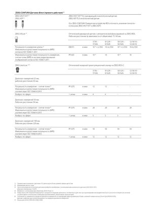 XDT ZEISS CONTURA Датчики direct (прямого действия) 7) ZEISS VAST XXT 1) ZEISS VAST XXT TL3: сканирующий и многоточечный датчик ZEISS XDT 7) ZEISS XDT TL3: многоточечный датчик (См. ZEISS CONTURA Поворотное устройство RDS и точность, значения точности – в описании ZEISS VAST XXT и ZEISS XDT) ZEISS ViScan 3) Оптический двумерный датчик с автоматической фокусировкой на ZEISS RDS. Рабочее расстояние (в зависимости от объектива): 75–90 мм. 7/7/6 – 9/12/8 – 10/12/6 – 12/18/10 – 7/10/6 9/16/8 10/16/6 12/24/10 Погрешность измерения длины 2) EB(XY) в мкм 10 4) + L/350 10 +L/350 10 4) + L/350 10+L/350 Максимально допустимая погрешность (MPE) согласно ISO 10360-7: 2011 Максимально допустимая погрешность измерения, PFV2D в мкм 10 4) 10 10 4) 10 снятие точки (MPE) в системе редактирования изображений согласно ISO 10360-7:2011 ZEISS LineScan 3) 5) Оптический лазерный триангуляционный сканер на ZEISS RDS-C 7/7/6 – 9/12/8 – 10/12/6 – 12/18/10 – 7/10/6 9/16/8 10/16/6 12/24/10 Диапазон измерений 25 мм, рабочее расстояние 63 мм. Погрешность измерения – снятие точки 6) PF (OT) в мкм 12 12 - - Максимально допустимая погрешность (MPE) соответствует ISO 10360-8:2013 Разброс по сфере 1 сигма в мкм 4 4 - - Диапазон измерений 50 мм. Рабочее расстояние 94 мм. Погрешность измерения – снятие точки 6) PF (OT) в мкм 20 20 20 20 Максимально допустимая погрешность (MPE) соответствует ISO 10360-8:2013 Разброс по сфере 1 сигма в мкм 5 5 5 5 Диапазон измерений 100 мм. Рабочее расстояние 220 мм. Погрешность измерения – снятие точки 6) PF (OT) в мкм 50 50 50 50 Максимально допустимая погрешность (MPE) соответствует ISO 10360-8:2013 Разброс по сфере 1 сигма в мкм 12 12 12 12 1) Приемочные испытания с датчиком TL3; длина щупа 50 мм, диаметр сферы щупа 3 мм 2) Измеряемая длина L в мм 3) При использовании оптических датчиков требуется калибровка с использованием контактного датчика (ZEISS VAST XXT). Диапазон температур: 18-26°C 4) Измерено с использованием объектива ZEISS ViScan 1x 5) Лазер класса 2M: открытый лазерный луч находится в видимом диапазоне, что безопасно для глаз при кратковременном воздействии (0,25 с), если его поперечное сечение не уменьшается оптическими приборами (умножителями, объективами, телескопами). 6) Погрешность измерения в середине диапазона измерений на подходящей сфере (диаметром 30 мм) с матовой поверхностью. [Form.Sph.D95%:Tr:ODS]. Данные о рабочем расстоянии базируются на середине диапазона измерений. 7) Только для ZEISS CONTURA X700/X1000