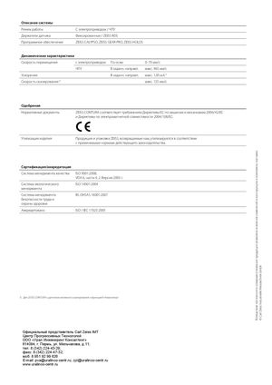 Вследствие постоянного совершенствования продукции возможно внесение изменений в конструкцию и комплекты поставки. © Carl Zeiss Industrielle Messtechnik Gmbh Описание системы Режим работы С электроприводом / ЧПУ Держатели датчика Фиксированные / ZEISS RDS Программное обеспечение ZEISS CALYPSO, ZEISS GEAR PRO, ZEISS HOLOS Динамические характеристики Скорость перемещения c электроприводом По осям 0–70 мм/с ЧПУ В заданн. направл. макс. 465 мм/с Ускорение В заданн. направл. макс. 1,85 м/с2 Скорость сканирования 1) макс. 125 мм/с Одобрения Нормативные документы ZEISS CONTURA соответствует требованиям Директивы ЕС по машинам и механизмам 2006/42/EC и Директивы по электромагнитной совместимости 2004/108/EC. Утилизация изделия Продукция и упаковка ZEISS, возвращаемые нам, утилизируются в соответствии с применимыми нормами действующего законодательства. Сертификация/аккредитация Система менеджмента качества ISO 9001:2008, VDA 6, части 4, 2. Версия 2005 г. Система экологического ISO 14001:2004 менеджмента Системы менеджмента BS OHSAS 18001:2007 безопасности труда и охраны здоровья Аккредитовано ISO / IEC 17025:2005 1) Для ZEISS CONTURA с датчиком активного сканирования и функцией «Навигатор» Официальный представитель Carl Zeiss IMT Центр Прогрессивных Технологий ООО «Урал Инжениринг Консалтинг» 614094, г. Пермь, ул. Мильчакова, д.11; тел: 8 (342) 224-43-29; факс: 8 (342) 224-47-32; моб. 8 951 92 99 626 E-mail: pva@uralinco-centr.ru, zpt@uralinco-centr.ru www.uralinco-centr.ru