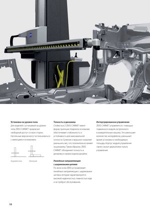 Уствновка на уровне пола Точность и динамика Интергрированное управление Для моделей с установкой на уровне Стойка оси Z ZEISS CARMET имеет ZEISS CARMET управляется с помощью пола ZEISS CARMET предлагает форму трапеции. Широкое основание подвижного модуля, встроенного свободный доступ со всех сторон. обеспечивает стабильность и в измерительную машину. Это уменьшает Напольные версии могут использоваться устойчивость для максимальной количество интерфейсов, уменьшает с имеющимся основанием. точности. Сужение к вершине позволяет время установки и необходимую уменьшить вес, что положительно влияет площадь. Корпус модуля управления на динамику. Таким образом, ZEISS также служит держателем пульта CARMET объединяет точность и управления. динамику в превосходном дизайне. На уровне пола Напольная Линейные направляющие с шариковыми цепями По всем осям ZEISS устанавливает линейные направляющие с шариковыми цепями, которые характеризуются высокой надежностью, плавностью хода и не требуют обслуживания. 10