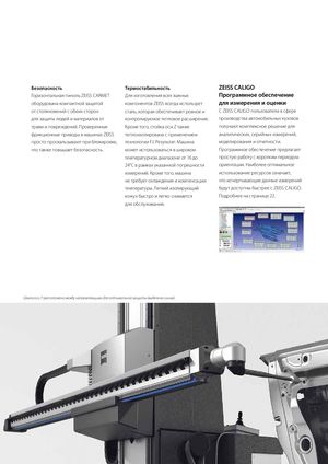 Безопасность Термостабильность ZEISS CALIGO Горизонтальная пиноль ZEISS CARMET Для изготовления всех важных Программное обеспечение оборудована компактной защитой компонентов ZEISS всегда использует для измерения и оценки от столкновений с обеих сторон сталь, которая обеспечивает ровное и С ZEISS CALIGO пользователи в сфере для защиты людей и материалов от контролируемое тепловое расширение. производства автомобильных кузовов травм и повреждений. Проверенные Кроме того, стойка оси Z также получают комплексное решение для фрикционные приводы в машинах ZEISS теплоизолирована с применением аналитических, серийных измерений, просто проскальзывают при блокировке, технологии F.I. Результат: Машина моделирования и отчетности. что также повышает безопасность. может использоваться в широком Программное обеспечение предлагает температурном диапазоне от 16 до простую работу с коротким периодом 24°C в рамках указанной погрешности ориентации. Наиболее оптимальное измерений. Кроме того, машина использование ресурсов означает, не требует охлаждения и компенсации что исчерпывающие данные измерений температуры. Легкий изолирующий будут доступны быстрее с ZEISS CALIGO. кожух быстро и легко снимается Подробнее на странице 22. для обслуживания. Шкала оси Y расположена между направляющими для оптимальной защиты (выделена синим). 11