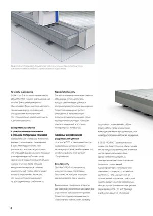 Измерительная стойка имеет большое поперечное сечение и только три контактные точки (Относится к напольным моделям и к устанавливаемым на уровне пола) Точность и динамика Термостабильность Стойка оси Z и горизонтальная пиноль Для изготовления важных компонентов ZEISS PRO/PRO T имеют трапециевидный ZEISS всегда использует сталь, дизайн. Трапециевидная форма которая обеспечивает ровное и обеспечивает более высокую жесткость контролируемое тепловое расширение. при меньшем весе по сравнению Кроме того, машина не требует с квадратными компонентами. охлаждения. В качестве опции Это положительно влияет на точность доступна термокомпенсация с пятью и динамику машины. термодатчиками, которая повышает точность измерений в условиях защитой от столкновений с обеих Измерительная стойка температурных колебаний. сторон. Из-за своей компактной с трехточечным подшипником конструкции она не затрудняет доступ к и большим поперечным сечением Линейные направляющие низкорасположенным точкам измерения. Измерительная стойка (ось X) является с шариковыми цепями важным соединением с основанием. На все оси ZEISS устанавливает опоры В ZEISS PRO/PRO T особо уязвимая В ZEISS PRO подшипники в нем с шариковыми цепями, которые шкала оси Y расположена в безопасном располагаются только в трех точках. характеризуются высокой надежностью, месте между направляющими в нижней Это упрощает выравнивание и повышает мягкостью работы и не требуют части горизонтальной стойки. долговременную стабильность по обслуживания. Здесь направляющие рельсы сравнению с подшипниками с большим одновременно выполняют функцию числом точек контакта. Большое Безопасность защиты от столкновений. квадратное поперечное сечение ZEISS PRO/PRO T поставляется с Характерная черта непрерывного измерительной стойки обеспечивает многочисленными средствами динамично поворотного держателя высокую внутреннюю жесткость, безопасности, которые защищают щупов CSC – это защищенный от что также положительно влияет как пользователя, так и машину. столкновений подшипник сенсорной на долговременную стабильность. пластиной датчика. В качестве опции Фрикционные приводы на всех осях оба доступных динамично поворотных уже имеют исключительно механические держателя щупов CSC и RDS) могут ограничения максимального усилия. снабжаться защитой от излома. Кроме того, горизонтальная пиноль снабжена чувствительной к контакту 16