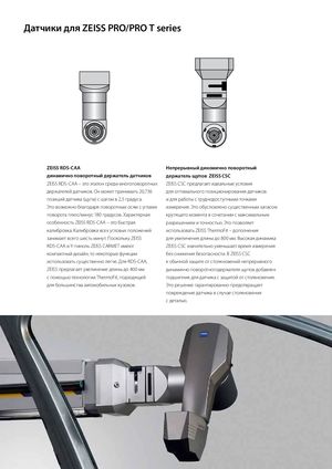 Датчики для ZEISS PRO/PRO T series ZEISS RDS-CAA Непрерывный диномично поворотный динамично поворотный держатель датчиков держатель щупов ZEISS CSC ZEISS RDS-CAA – это эталон среди многоповоротных ZEISS CSC предлагает идеальные условия держателей датчиков. Он может принимать 20,736 для оптимального позиционирования датчиков позиций датчика (щупа) с шагом в 2,5 градуса. и для работы с труднодоступными точками Это возможно благодаря поворотным осям с углами измерения. Это обусловлено существенным запасом поворота плюс/минус 180 градусов. Характерная крутящего момента в сочетании с максимальным особенность ZEISS RDS-CAA – это быстрая разрешением и точностью. Это позволяет калибровка. Калибровка всех угловых положений использовать ZEISS ThermoFit – дополнения занимает всего шесть минут. Поскольку ZEISS для увеличения длины до 800 мм. Высокая динамика RDS-CAA и Y-пиноль ZEISS CARMET имеют ZEISS CSC значительно уменьшает время измерения компактный дизайн, то некоторые функции без снижения безопасности. В ZEISS CSC использовать существенно легче. Для RDS-CAA, к обычной защите от столкновений непрерывного ZEISS предлагает увеличение длины до 400 мм динамично поворотногодержателя щупов добавлен с помощью технологии ThermoFit, подходящей подшипник для датчика с защитой от столкновения. для большинства автомобильных кузовов. Это решение гарантированно предотвращает повреждение датчика в случае столкновения с деталью. 18