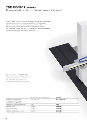 ZEISS PRO/PRO T premium Премиальный дизайн с особенностями в комплекте The ZEISS PRO/PRO T premium включает в себя все улучшения производительности, которые доступны для серии PRO. Цельный корпус, автоматическая термокомпенсация, высочайшие точность и скорость являются неотъемлимыми компонентами ZEISS PRO/PRO T premium. Версия “premium” – это ZEISS PRO/PRO T advance со всеми опциями. Модели имеют одинаковые диапазоны измерений, конструкцию, принадлежности и датчики. Базовое оборудование advanced premium Максимально допустимая 27 + L/80 ≤ 70 18 + L/125 ≤ 50 wпогрешность (MPE E) [мкм] (Y = 1600 мм, Z = 2500 мм) Максимальное ускорение [мм/см2] 1000 1500 Цельный корпус опция стандарт Термокомпенсация опция стандарт "Высокая точность" опция стандарт "Высокая производительность" опция стандарт 20