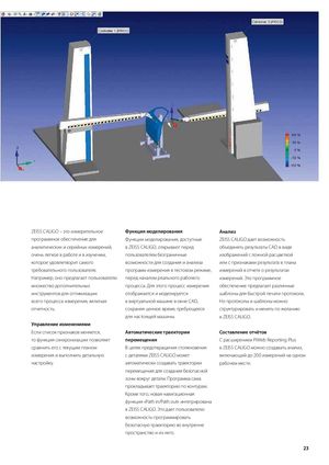 ZEISS CALIGO – это измерительное Функция моделирования Анализ программное обеспечение для Функции моделирования, доступные ZEISS CALIGO дает возможность аналитических и серийных измерений, в ZEISS CALIGO, открывают перед объединять результаты CAD в виде очень легкое в работе и в изучении, пользователем безграничные изображений с ложной расцветкой которое удовлетворит самого возможности для создания и анализа или с признаками результата в плана требовательного пользователя. программ измерения в тестовом режиме, измерений в отчете о результатах Например, оно предлагает пользователю перед началом реального рабочего измерений. Это программное множество дополнительных процесса. Для этого процесс измерения обеспечение предлагает различные инструментов для оптимизации отображается и моделируется шаблоны для быстрой печати протокола. всего процесса измерения, включая в виртуальной машине в окне CAD, Но протоколы и шаблоны можно отчетность. сохраняя ценное время, требующееся структурировать и менять по желанию для настоящей машины. в ZEISS CALIGO. Управление изменениями Если список признаков меняется, Автоматические траектории Составление отчётов то функция синхронизации позволяет перемещения C расширением PiWeb Reporting Plus сравнить его с текущим планом В целях предотвращения столкновения в ZEISS CALIGO можно создавать анализ, измерения и выполнить детальную с деталями ZEISS CALIGO может включающий до 200 измерений на одном настройку. автоматически создавать траектории рабочем месте. перемещения для создания безопасной зоны вокруг детали. Программа сама прокладывает траекторию по контурам. Кроме того, новая навигационная функция «Path in/Path out» интегрирована в ZEISS CALIGO. Это дает пользователю возможность программировать безопасную траекторию во внутренне пространство и из него. 23