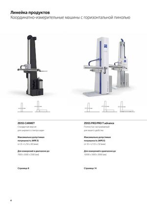 Линейка продуктов Координатно-измерительные машины с горизонтальной пинолью ZEISS CARMET ZEISS PRO/PRO T advance Стандартная версия Полностью настраиваемый для широкого спектра задач для вашего удобства Максимально допустимая Максимально допустимая погрешность (MPE E) погрешность (MPE E) от 35 + L/50 ≤ 80 [мкм] от 18 + L/125 ≤ 50 [мкм] Для измерений в диапазоне до Для измерений в диапазоне до 7000 x 3000 x 2500 [мм] 10000 x 3000 x 3000 [мм] Страница 8 Страница 14 4