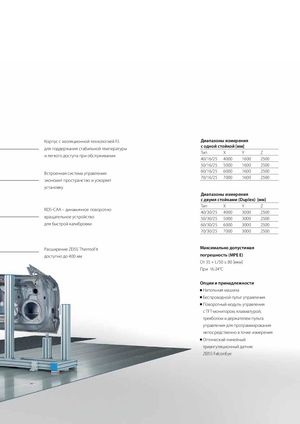 Корпус с изоляционной технологией F.I. Диапазоны измерения для поддержания стабильной температуры с одной стойкой [мм] Тип X Y Z и легкого доступа при обслуживании 40/16/25 4000 1600 2500 50/16/25 5000 1600 2500 Встроенная система управления: 60/16/25 6000 1600 2500 экономит пространство и ускоряет 70/16/25 7000 1600 2500 установку Диапазоны измерения с двумя стойками (Duplex) [мм] Тип X Y Z RDS-CAA – динамичное поворотно- 40/30/25 4000 3000 2500 вращательное устройство 50/30/25 5000 3000 2500 для быстрой калибровки 60/30/25 6000 3000 2500 70/30/25 7000 3000 2500 Расширение ZEISS ThermoFit Максимально допустимая доступно до 400 мм погрешность (MPE E) От 35 + L/50 ≤ 80 [мкм] При 16-24°C Опции и принадлежности Напольная машина Беспроводной пульт управления Поворотный модуль управления с TFT-монитором, клавиатурой, трекболом и держателем пульта управления для программирования непосредственно в точке измерения Оптический линейный триангуляционный датчик ZEISS FalconEye 9
