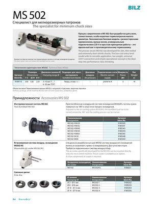 MS 502 Специалист для мелкоразмерных патронов The specialist for minimum chuck sizes Процесс закрепления в MS 502 был разработан для узких, тонкостенных, особо коротких термопатронов малого диаметра. Экономичная базовая модель с разносторонним применением, малым весом, универсальным подключением 220 V и простым принципом работы – это идеальный шаг к производительному термозажиму. The process secure MS 502 was developed for slim, thin-walled and extremely short shrink chucks. The low-cost entry-level model with its versatile application, low weight, universal Базовая система не включает инструментальную гантель и систему охлаждения воздухом 220 V-connection and simple operational concept is the ideal The basic system does not include tool dumbbell and air cooler. step into performance class shrinking. Технические характеристики: MS502 Technical Data: MS502 Размеры Диапазон зажима Ø Подходит для хвост. Давление Подключение к сети Мощность Вес Артикул Dimensions Clamping range Ø инструмента воздуха Electric current Power Weight Ident No. ГD ШW ВH Suitable tool shanks Air pressure supply кВт кг 9184715 350 520 220 3–16 мм (T…) Тверд. сплав (SC) – 230 В/16 A 3 14 6–20 мм (TSF) Объем поставки: Термозажимная машина MS502 с катушкой и 4 дисками, защитные перчатки Delivery package: shrink machine MS 502 with coil and 4 pole discs, protectove gloves Принадлежности Accessories MS 502 Инструментальная гантель MS 502 Приспособленная к воздушной системе охлаждения MS502KS, гантель нужно Tool dumbbell MS502 повернуть на 180° и запустится процесс охлаждения. Adjusted to the air cooling system MS502KS, the dumbbell just has to be turned around by 180° and the cooling process can be started. Наименование Артикул Designation Ident No. MS 502-HSK25 9185320 MS 502-HSK32 9185341 MS 502-HSK40 9185343 MS 502-HSK50 9185344 MS 502-HSK63 9185345 MS 502-SK30 9185348 MS 502-SK40 9185350 Встраиваемая система воздуш. охлаждения Специально разработанную для MS502 систему воздушного охлаждения MS502 KS можно устанавливать прямо на микромашину. Доступна как опция. Mountable air cooler MS 502 KS Требуется подключение к сжатому воздуху 6 бар. The air cooler, specifically developed for the MS502, can be mounted directly onto the micro shrink machine. The air cooler is available as an option. A 6-bar compressed air supply is required. Воздушное охлаждение Наименование Артикул Air cooler Designation Ident No. MS 502 MS 502 KS 9186531 Сменные диски Pole disc Ø зажима Наименование Артикул Clamping-Ø Designation Ident No. Ø 3 – Ø 5 мм MS 502-1 9185352 Ø 6 – Ø 8 мм MS 502-2 9185353 Ø 10 – Ø 12 мм MS 502-3 9185354 Ø 14 – Ø 16 мм MS 502-4 9185356 24 ThermoGrip®