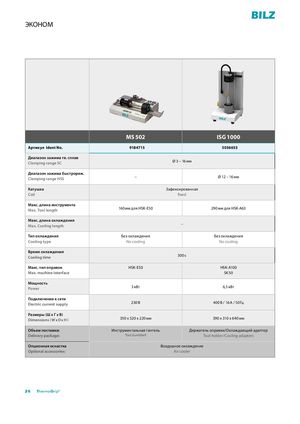 ЭКОНОМ MS 502 ISG 1000 Артикул Ident No. 9184715 5036653 Диапазон зажима тв. сплав Clamping range SC Ø 3 – 16 мм Диапазон зажима быстрореж. Clamping range HSS – Ø 12 – 16 мм Катушка Зафиксированная Coil fixed Maкс. длина инструмента Max. Tool length 160 мм для HSK-E50 290 мм для HSK-A63 Maкс. длина охлаждения Max. Cooling length – Тип охлаждения Без охлаждения Без охлаждения Cooling type No cooling No cooling Время охлаждения Cooling time 300 с Maкс. тип оправок HSK-E50 HSK-A100 Max. machine interface SK 50 Мощность Power 3 кВт 6,5 кВт Подключение к сети Electric current supply 230 В 400 В / 16 A / 50 Гц Размеры (Ш x Г x В) Dimensions ( W x D x H ) 350 x 520 x 220 мм 390 x 310 x 640 мм Объем поставки: Инструментальная гантель Держатель оправки/Охлаждающий адаптер Delivery package: Tool dumbbell Tool holder /Cooling adapters Опционная оснастка Воздушное охлаждение Optional accessories: Air cooler 26 ThermoGrip®