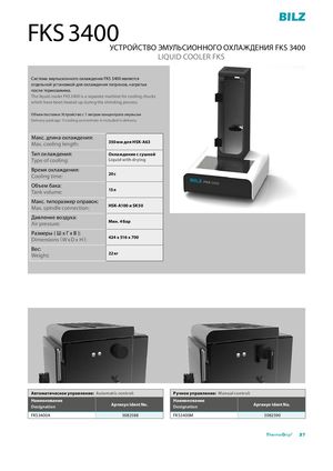 FKS 3400 УСТРОЙСТВО ЭМУЛЬСИОННОГО ОХЛАЖДЕНИЯ FKS 3400 LIQUID COOLER FKS Система эмульсионного охлаждения FKS 3400 является отдельной установкой для охлаждения патронов, нагретых после термозажима. The liquid cooler FKS 3400 is a separate machine for cooling chucks which have been heated up during the shrinking process. Объем поставки: Устройство с 1 литром концентрата эмульсии Delivery package: 1l cooling concentrate in included in delivery Макс. длина охлаждения: Max. cooling length: 350 мм для HSK-A63 Тип охлаждения: Охлаждение с сушкой Type of cooling: Liquid with drying Время охлаждения: Cooling time: 20 с Объем бака: Tank volume: 15 л Макс. типоразмер оправок: Max. spindle connection: HSK-A100 и SK50 Давление воздуха: Air pressure: Мин. 4 бар Размеры ( Ш x Г x В ): Dimensions ( W x D x H ): 424 x 516 x 700 Вес: Weight: 22 кг Автоматическое управление: Automatic control: Ручное управление: Manual control: Наименование Наименование Designation Артикул Ident No. Designation Артикул Ident No. FKS3400A 5082588 FKS3400M 5082590 ThermoGrip® 27