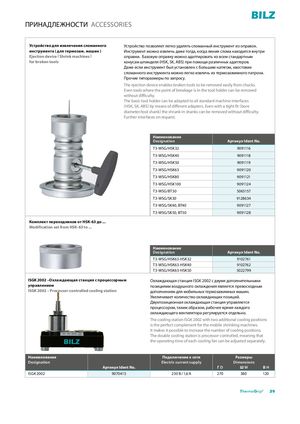 ПРИНАДЛЕЖНОСТИ ACCESSORIES Устройство для извлечения сломанного Устройство позволяет легко удалять сломанный инструмент из оправок. инструмента ( для термозаж. машин ) Инструмент можно извлечь даже тогда, когда линия слома находится внутри Ejection device ( Shrink machines ) оправки. Базовую оправку можно адаптировать ко всем стандартным for broken tools конусам шпинделя (HSK, SK, ABS) при помощи различных адаптеров. Даже если инструмент был установлен с большим натягом, хвостовик сломанного инструмента можно легко извлечь из термозажимного патрона. Прочие типоразмеры по запросу. The ejection device enables broken tools to be removed easily from chucks. Even tools where the point of breakage is in the tool holder can be removed without difficulty. The basic toolholder can be adapted to all standard machine interfaces (HSK, SK, ABS) by means of different adapters. Even with a tight fit (bore diameter/tool shank) the shrunk-in shanks can be removed without difficulty. Further interfaces on request. Наименование Designation Артикул Ident No. T3-WSG/HSK32 9091116 T3-WSG/HSK40 9091118 T3-WSG/HSK50 9091119 T3-WSG/HSK63 9091120 T3-WSG/HSK80 9091121 T3-WSG/HSK100 9091124 T3-WSG/BT30 5065157 T3-WSG/SK30 9128634 T3-WSG/SK40, BT40 9091127 T3-WSG/SK50, BT50 9091128 Комплект переходников от HSK-63 до ... Modification set from HSK-63 to ... Наименование Designation Артикул Ident No. T3-WSG/HSK63-HSK32 9102761 T3-WSG/HSK63-HSK40 9102762 T3-WSG/HSK63-HSK50 5022799 ISGK 2002 –Охлаждающая станция с процессорным Охлаждающая станция ISGK 2002 с двумя дополнительными управлением позициями воздушного охлаждения является превосходным ISGK 2002 – Processor-controlled cooling station дополнением для мобильных термозажимных машин. Увеличивает количество охлаждающих позиций. Двухпозиционная охлаждающая станция управляется процессором, таким образом, рабочее время каждого охлаждающего вентилятора регулируется отдельно. The cooling station ISGK 2002 with two additional cooling positions is the perfect complement for the mobile shrinking machines. It makes it possible to increase the number of cooling positions. The double cooling station is processor-controlled, meaning that the operating time of each cooling fan can be adjusted separately. Наименование Подключение к сети Размеры Designation Electric current supply Dimensions Артикул Ident No. ГD ШW ВH ISGK 2002 9070415 230 В / 1,6 A 270 380 120 ThermoGrip® 29