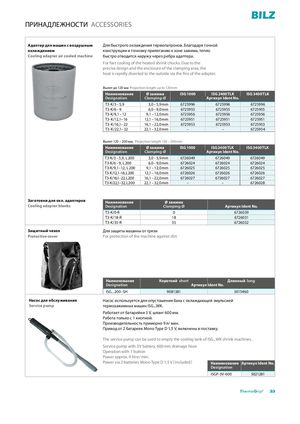 ПРИНАДЛЕЖНОСТИ ACCESSORIES Адаптер для машин с воздушным Для быстрого охлаждения термопатронов. Благодаря точной охлаждением конструкции и точному прилеганию к зоне зажима, тепло Cooling adapter air cooled machine быстро отводится наружу через ребра адаптера. For fast cooling of the heated shrink chucks. Due to the precise design and the enclosure of the clamping area, the heat is rapidly diverted to the outside via the fins of the adapter. Вылет до 120 мм Projection length up to 120 mm Наименование Ø зажима ISG 1000 ISG 2400 TLK ISG 3400 TLK Designation Clamping-Ø Артикул Ident No. T3-K/3 – 5,9 3,0 – 5,9 mm 6725996 6725996 6725996 T3-K/6 – 9 6,0 – 9,0 mm 6725955 6725955 6725955 T3-K/9,1 – 12 9,1 – 12,0 mm 6725956 6725956 6725956 T3-K/12,1– 16 12,1 – 16,0 mm 6725951 6725951 6725951 T3-K/16,1– 22 16,1 – 22,0 mm 6725953 6725953 6725953 T3-K/22,1– 32 22,1 – 32,0 mm – – 6725954 Вылет 120 – 200 мм. Projection length 120 – 200 mm Наименование Ø зажима ISG 1000 ISG 2400 TLK ISG 3400 TLK Designation Clamping-Ø Артикул Ident No. T3-K/3 – 5,9, L 200 3,0 – 5,9 mm 6726049 6726049 6726049 T3-K/6 – 9, L 200 6,0 – 9,0 mm 6726024 6726024 6726024 T3-K/9,1–12, L 200 9,1 – 12,0 mm 6726025 6726025 6726025 T3-K/12,1–16, L 200 12,1 – 16,0 mm 6726026 6726026 6726026 T3-K/16,1– 22, L 200 16,1 – 22,0 mm 6726027 6726027 6726027 T3-K/22,1– 32, L 200 22,1 – 32,0 mm – – 6726028 Заготовки для охл. адаптеров Наименование Ø зажима Cooling adapter blanks Designation Clamping-Ø Артикул Ident No. T3-K/0-R 0 6726039 T3-K/18-R 18 6726031 T3-K/35-R 35 6726032 Защитный чехол Для защиты машины от грязи Protective cover For protection of the machine against dirt Наименование Короткий short Длинный long Designation Артикул Ident No. ISG...200–SH 9081381 5015460 Насос для обслуживания Насос используется для опустошения бака с охлаждающей эмульсией Service pump термозажимных машин ISG...WK. Работает от батарейки 3 V, шланг 600 мм. Работа только с 1 кнопкой. Производительность примерно 9 л/ мин. Привод от 2 батареек Mono Type D 1,5 V, включены в поставку. The service pump can be used to empty the cooling tank of ISG...WK shrink machines. Service pump with 3 V battery, 600 mm drainage hose Operation with 1 button Power approx. 9 litre / min. Power via 2 batteries Mono Type D 1,5 V ( included ) Наименование Артикул Ident No. Designation ISGP-3V-600 5021281 ThermoGrip® 33