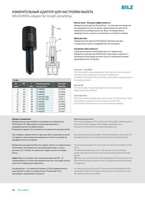 ИЗМЕРИТЕЛЬНЫЙ АДАПТЕР ДЛЯ НАСТРОЙКИ ВЫЛЕТА MEASURING adapter for length presetting Низкая цена – Большая эффективность Измерительный адаптер ThermoGrip® - это экономичное решение для предварительной настройки, характеризуется простотой применения и универсальностью. Вылет в оправке можно предварительно настроить независимо от устройства зажима. Один для всех Измерительный адаптер ThermoGrip® пригоден для всех стандартных устройств предварительной настройки. Снижение себестоимости Сокращение времени благодаря простоте применения. Измерительный адаптер ThermoGrip® гарантирует надежность производства благодаря высокой точности размеров во время предварительной настройки. Low price – big effect The ThermoGrip® measuring adapter is the low cost entry into preset- ting and is characterized by to its simple handling and versatility. The length in the tool holder can be preset independently of T3-M... the clamping device. d1 SW L Наименование Артикул [мм] [мм] Designation Ident No. One for allThe ThermoGrip® measuring adapter works on all standard 6 2,5 80 T3-M0600 6725959 length presetting machines. 8 3,0 80 T3-M0800 6725962 10 4,0 80 T3-M1000125,080T3-M1200-SW5145,080T3-M1400-SW5672596367261116726112Cost reductionDue to the simple handling, time can be saved. The ThermoGrip® meas- 16 6,0 80 T3-M1600 6725967 uring adapter guarantees process security in production 18 6,0 80 T3-M1800 6725968 due to higher dimensional accuracy at the length presetting. 20 8,0 80 T3-M2000 6725969 25 8,0 80 T3-M2500 6725970 32 8,0 80 T3-M3200 6725971 Процесс измерения: Measurement process Измерительный адаптер (B) устанавливается в термопатрон The measuring adapter ( B) is put into the ThermoGrip® shrink chuck ( A ) ThermoGrip® (A) и фиксируется в шестиграннике винта and locks into the hexagon of the length presetting screw. предварительной настройки вылета. The tool (C) is inserted in the measuring adapter ( B). Режущий инструмент (C) вставляется в измерительный адаптер (B). При повороте измерительного адаптера (B) устанавливается вылет By turning the measuring adapter ( B) the tool length is determined via инструмента при помощи регулировочного винта и устройства the adjusting screw in the check by the help of a presetting device. предварительной настройки. Измерительный адаптер (B) затем следует извлечь из термопатрона The measuring adapter ( B) is then taken out of the ThermoGrip® shrink ThermoGrip® (A). В результате настройки должна быть учтена chuck. разница (L) (L = 80 мм). Эту величину следует вычесть из общей The differential dimension (L) (L = 80 mm) has to be considered длины. during adjusting. This stored value has to be deducted from the total length. Совет: Будьте осторожны при извлечении адаптера (B) – не Tip: Take care not to turn the measuring adapter ( B) when taking it out. поворачивайте его. Иначе регулировочный винт настройки вылета Otherwise the length adjusting screw is displaced and the total length сместится и общая длина изменится. is readjusted. Последний шаг - установите инструмент (C) без измерительного As a last step you put the tool (C) without measuring adapter into the адаптера (B) в отверстие термопатрона ThermoGrip® (A) и counterbore of the ThermoGrip® shrink chuck ( A ) and shrink it on the произведите термозажим на машине. ISG machine of your own choice. 38 ThermoGrip®