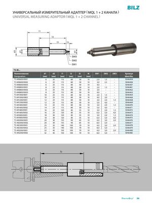 d2 d1 d1 УНИВЕРСАЛЬНЫЙ ИЗМЕРИТЕЛЬНЫЙ АДАПТЕР ( MQL 1 + 2 КАНАЛА ) UNIVERSAL MEASURING ADAPTOR ( MQL 1 + 2 CHANNEL ) l1 l2 l3 l4 SW3 SW2 SW1 T3-M... Наименование d1 d2 l1 l2 l3 l4 SW1 SW2 SW3 Артикул Designation [мм] [мм] [мм] [мм] [мм] [мм] Ident No. T3-M0600/0001 6 25 115 80 50 10 2,0 1,5 – 5046404 T3-M0600/0002 6 25 115 80 50 10 3,0 2,5 – 5046406 T3-M0600/0003 6 25 115 80 50 10 4,0 – – 5046407 T3-M0800/0001 8 25 115 80 50 10 2,0 1,5 – 5046461 T3-M0800/0002 8 25 115 80 50 10 3,0 – – 5046462 T3-M0800/0003 8 25 115 80 50 10 4,0 – – 5046463 T3-M1000/0001 10 25 115 80 50 10 2,0 1,5 – 5046464 T3-M1000/0002 10 25 115 80 50 10 4,0 3,0 – 5046466 T3-M1200/0001 12 25 115 80 50 10 3,0 2,0 1,5 5046468 T3-M1200/0002 12 25 115 80 50 10 5,0 4,0 – 5046469 T3-M1400/0001 14 25 115 80 50 10 3,0 2,0 1,5 5046470 T3-M1400/0002 14 25 115 80 50 10 5,0 4,0 – 5046471 T3-M1600/0001 16 25 120 85 55 10 3,0 2,0 1,5 5046472 T3-M1600/0002 16 25 120 85 55 10 6,0 5,0 4,0 5046473 T3-M1800/0001 18 30 120 85 55 10 3,0 2,0 1,5 5046474 T3-M1800/0002 18 30 120 85 55 10 6,0 5,0 4,0 5046475 T3-M2000/0001 20 30 135 90 65 10 4,0 3,0 2,0 5046476 T3-M2000/0002 20 30 135 90 65 10 8,0 5,0 – 5046477 T3-M2500/0001 25 35 140 100 70 10 4,0 3,0 2,0 5046478 T3-M2500/0002 25 35 140 100 70 10 8,0 5,0 – 5046479 T3-M3200/0001 32 45 150 100 70 10 4,0 3,0 2,0 5046480 T3-M3200/0002 32 45 150 100 70 10 8,0 5,0 – 5046482 l2 ThermoGrip® 39