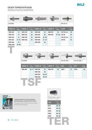 ОSБcЗhОruРmТpЕfРfuМttОeПr АÜТbРeОrsНicОhВt Shrink Chucks Overview SHRINK CHUCKS OVERVIEW DIN 69893 ANSI B5.50 HSK-A Стр.PageHSK-C Стр.PageHSK-E Стр.PageHSK-F Стр.Page CAT Стр.Page HSK-A32 13 HSK-C32 23 HSK-E25 24 HSK-F40 36 CAT 40 Inch 39 HSK-A40 13 HSK-C40 23 HSK-E32 25 HSK-F63 37 – 83 CAT 40 40 HSK-A50 13 HSK-C50 23 HSK-E40 27 – 28 CAT 50 Inch 41 HSK-A63 14 – 15 HSK-C63 23 HSK-E50 31 – 32 CAT 50 42 HSK-A80 18 HSK-E63 35 HSK-A100 19 – 20 T DIN 69893 DIN ISO7388 -1 DIN ISO7388 -2 HSK-A Стр.PageHSK-E Стр.PageHSK-F Стр.Page AD Стр.PageBT Стр.Page HSK-A63 16 – 17 HSK-E25 24 HSK-F40 36 AD40 47 BT40 52 HSK-E32 26 HSK-E40 29– 30 HSK-E50 33– 34 TSF ThermoGrip® Schrumpfspannfutter ER Термозажим. адаптер Member of the LEITZ Group Shrink Chucks Страницы указаны согласно каталогу ER Shrink Fit Adapter термозажимных патронов ThermoGrip®The page numbers refer to the ThermoGrip®ERСтр.Page Shrink Chucks catalogue ER11 62 – 63 www.bilz.de ER16 62 – 63 ER20 62 – 63 ER25 62 – 63 ER32 62 – 63 40 ThermoGrip® TER