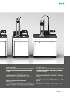 PROFESSIONAL HEAVY DUTY Автоматическое устройство с эмульсионным охлаждением Автоматическое устройство с эмульсионным охлаждением и сушкой для усиленных патронов Время охлаждения: 30 с Время охлаждения: 45 с Полностью автоматизированный процесс обеспечивает Термозажим и охлаждение крупных и усиленных патронов максимальную безопасность оператора, так как нагретый осуществляется автоматически без необходимости перемещения термопатрон перемещается вниз непосредственно в позицию патронов. охлаждения, оператору не требуется трогать горячий патрон. Automatic device with liquid cooling for heavy holders, cooling Automatic device with liquid cooling and drying, time: 45 s cooling time: 30 s Big and heavy toolholders are shrunk automatically and are then The fully automated process guarantees maximum operator safety, as cooled directly without the need for handling during the process. the heated shrink chuck is lowered directly into the cooling position following the shrinking procedure, without the operator being able to touch the hot chuck. ThermoGrip® 5