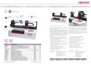 Schrumpfgerät US 1100 horizontal Shrink Unit US 1100 horizontal Schrumpfgerät US 1100 horizontal Shrink Unit US 1100 horizontal Video: US 1100 horizontal in Aktion US 1100 horizontal in action Längeneinstellung Universalspanner79.500.900.U mit Messuhr79.500.800.400 TempControl PyrometerSpule79.500.800.205 Abbildung mit Grundhalter und Werkzeugaufnahme HSK 63 Mit dem horizontalen Schrumpfgerät US 1100 können Shrink range Ø 3 – 32 mm for carbide shanks and Schrumpfaufnahmen von Ø 3 – 32 mm (HM) und Ø 6 – 32 mm Ø 6 – 32 mm for HSS shanks. The coil with optional pyro- Grundhalter79.500.900.001 (HSS) geschrumpft werden. meter technology allows automatic and direct temperatureDie optionale Pyrometerspule ermöglicht zusätzlich eine auto-control of the shrink chuck during heating.The shrink chuck matische und direkte Temperaturkontrolle des Schrumpffutters can no more be overheated. während des Aufheizens. Ein Verglühen des Schrumpffutters Manual operation with paramters or one button for manual ist dadurch ausgeschlossen. Der sichere und schnelle operation. The safe and fast shrinking process does not need Schrumpfvorgang benötigt keine vorherige Identifikation des a prior identification of the shrink chuck. Schrumpffutters. Automatisiertes Schrumpfen mit Parametern oder manuell mit nur einer Taste ist im Standardgerät mit Spule Basic integriert. • Die Schrumpffutter werden in flexibel wechselbarenWerkzeugaufnahmen (HSK25 bis HSK100 und SK/BT30 bis SK/BT50) fest eingespannt und die Spule über•Changeable adapters HSK 25 to HSK 100 orSK/BT 30 to SK/BT 50 to hold the ShrinkFittool holders in the shrink position den Werkzeughalter bewegt • With the universal tool vice für all tool taper types • Ein universeller Werkzeugspanner, in dem alle it is possible to clamp all taper sizes centric Aufnahmekonturen zentrisch gespannt werden können, • Manual operation with power button or i 4.0 steht ebenfalls zur Verfügung automatic with parameters • Verschlissene oder abgebrochene Schneidwerkzeuge • Automatic shrinking with Pyrometer (TempControl) Bestell-Nr. Beschreibung ZubehörOrder-No.Description Accessories SeitePage können mit einer integrierten Abdrückvorrichtung • Broken tool removal unit availableausgestoßen werden 79.500.800.205 Pyrometerspule / Coil with pyrometer technology ○ optional 8–979.500.800.400Längeneinstellung mit Messuhr / Length adjustment device with dial gauge○ optional32•Mit einer nachrüstbaren Zusatzvorrichtung•Additional of a length setting unit 79.500.800.410 Längeneinstellung mit Festanschlag / Length adjustment device with fixed stop ○ optional 32 ist eine genaue Längeneinstellung möglich • For cool down of the shrink holders we 79.402 Flüssigkeitskühler FKS 04 S automatik gesteuert / Chiller unit automatic ○ optional 24–2579.403Flüssigkeitskühler FKS 04 mit manueller Pneumatiksteuerung / Chiller unit manually○ optional24–25•Zum Kühlen der Werkzeuge empfehlen wir unserenrecommend to use our chiller unit FKS 04 S In Planung / In preview Schnittstellen Reader / Scanner ○ optional 35 Flüssigkeitskühler FKS 04 S In Planung / In preview Industrie 4.0 ready ○ optional 35 79.500.900.001 Grundhalter / Basic Holder ■ zwingend notwendig / necessary 3079.500.900.025Werkzeugaufnahme / Tool AdapterHSK25○ optional30Schrumpflänge:ca. 500 mm Shrink length: ca. 500 mm 79.500.900.032 Werkzeugaufnahme / Tool Adapter HSK32 ○ optional 30 Lieferumfang: US 1100 horizontal (79.500.100) Delivery Includes: Shrink Unit horizontal (79.500.100) 79.500.900.040 Werkzeugaufnahme / Tool Adapter HSK40 ○ optional 3079.500.900.050Werkzeugaufnahme / Tool AdapterHSK50○ optional30Spule Basic (79.500.800.200) Basic coil (79.500.800.200) 79.500.900.063 Werkzeugaufnahme / Tool Adapter HSK63 ○ optional 30 mit 5 Ferritscheiben, 5 interchangeable discs, 79.500.900.100 Werkzeugaufnahme / Tool Adapter HSK100 ○ optional 30 1 Paar Schutzhandschuhe Set of gloves 79.500.900.130 Werkzeugaufnahme / Tool Adapter SK30 / BT30 ○ optional 30 optional auch mit Pyrometerspule optional coil with 79.500.900.140 Werkzeugaufnahme / Tool Adapter SK40 / BT40 ○ optional 3079.500.900.150Werkzeugaufnahme / Tool AdapterSK50 / BT50○ optional3079.500.900.UUniversalspanner für alle Schnittstellen / Vice for all taper types○ optional30(79.500.800.205).pyrometer technology(79.500.800.205). 79.TER.411 Einsätze für Spannzangen TER 11 / Adapters for TER Collets TER 11 ○ optional 31 79.TER.416 Einsätze für Spannzangen TER 16 / Adapters for TER Collets TER 16 ○ optional 31 79.TER.420 Einsätze für Spannzangen TER 20 / Adapters for TER Collets TER 20 ○ optional 31 Bestell-Nr. Abmessung Leistung Schrumpfbereich Max. Schrumpflänge Anschluss 79.TER.425 Einsätze für Spannzangen TER 25 / Adapters for TER Collets TER 25 ○ optional 31 Order-No. Dimensions Power Shrink Range Max. Shrink Length Power Supply 79.TER.432 Einsätze für Spannzangen TER 32 / Adapters for TER Collets TER 32 ○ optional 31 79.500.100 700 x 470 x 387 (LxTxH) 11 kW Ø 3 – 32 500 mm 400 V / 16 A 18 Werkzeugaufnahmen bitte separat bestellen.Flüssigkeitskühler FKS 04 S bitte separat bestellen. Tool adapters to be ordered separately.Chiller Unit FSK 04 S to be ordered separately. 19