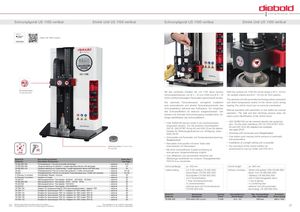 Schrumpfgerät US 1100 vertikal Shrink Unit US 1100 vertical Schrumpfgerät US 1100 vertikal Shrink Unit US 1100 vertical Video: US 1100 in action TempControl Pyrometerspule79.500.800.205 Mit den vertikalen Geräten der US 1100 Serie können With the vertical US 1100 the shrink range is Ø 3 – 32 mm Schrumpfaufnahmen von Ø 3 – 32 mm (HM) und Ø 6 – 32 for carbide shanks and Ø 6 – 32 mm for HSS shanks. (HSS) mit fest hinterlegten Parametern geschrumpft werden. The optional coil with pyrometer technology allows automatic Die optionale Pyrometerspule ermöglicht zusätzlich and direct temperature control of the shrink chuck during eine automatische und direkte Temperaturkontrolle des heating.The shrink chuck can no more be overheated. Schrumpffutters während des Aufheizens. Ein VerglühendesSchrumpffuttersistdadurchausgeschlossen.Dersichere und schnelle Schrumpfvorgang benötigt keine vor-herige Identifikation des Schrumpffutters.Manual operation with paramters or one button for manualoperation. The safe and fast shrinking process does notneed a prior identification of the shrink chuck. • HSK 63/80/100 können direkt in die Zentrierscheibeeingesetzt werden. Für die anderen Schnittstellen(SK 25, SK/CAT/BT 30 bis 40 und HSK 25 bis 50) stehenAdapter für Werkzeugaufnahmen zur Verfügung, siehe•HSK 63/80/100 can be inserted directly into centeringdisc. For the other interfaces (SK 25, SK/CAT/BT 30 to40 und HSK 25 to 50) adapters are available,see page 28-29 Seite 28-29 • Shrinking with Pyrometer and TempControl • Schrumpfen mit Pyrometer und Temperaturüberwachung • One button push manual shrink process or automatic TempControl with parameters • Manuelles Schrumpfen mit einer Taste oder • Installation of a length setting unit is possible Zentrierscheibe / Center Disc automatisiert mit Parametern • For cool down of the shrink holders we 79.220.003 • Mit einer nachrüstbaren Zusatzvorrichtung ist recommend to use our chiller unit FKS 04 S i 4.0 eine genaue Längeneinstellung möglich • Zum effektiven und schonenden Abkühlen der Bestell-Nr. Beschreibung Zubehör Siehe Seite Werkzeuge empfehlen wir unseren Flüssigkeitskühler Order-No. Description Accessories See Page FKS 04 S zu verwenden 79.500.800.205 Pyrometerspule / Coil with pyrometer technology ○ optional 8–9 79.500.800.400 Längeneinstellung mit Messuhr / Length adjustment device with dial gauge ○ optional 34 Schrumpflänge: ca. 500 mm Shrink length: ca. 500 mm 79.500.800.410 Längeneinstellung mit Festanschlag / Length adjustment device with fixed stop ○ optional 3479.402Flüssigkeitskühler FKS 04 S automatik gesteuert / Chiller unit automatic○ optional24–25Lieferumfang:US 1100 vertikal (79.500.200):Delivery Includes:Shrink Unit vertical 1100 (79.500.200): 79.403 Flüssigkeitskühler FKS 04 mit manueller Pneumatiksteuerung / Chiller unit manually ○ optional 24–25 Spule Basic (79.500.800.200) Basic Coil (79.500.800.200) In Planung / In preview Schnittstellen Reader / Scanner ○ optional 35 Grundplatte (79.500.800.300) Tabletop (79.500.800.300) In Planung / In preview Industrie 4.0 ready ○ optional 3579.220.011Werkzeugaufnahme / Tool adapterSK30/40CAT30/40BT30/40○ optional3379.500.900.450Werkzeugaufnahme / Tool adapterSK50CAT50BT50○ optional28mit 5 Ferritscheiben,with 5 interchangeable discs,1 Paar Schutzhandschuhe1 Set of gloves 79.220.020 Werkzeugaufnahme / Tool adapter HSK25/32 ○ optional 33 1x Zentrierscheibe 1x Centering disc 79.220.021 Werkzeugaufnahme / Tool adapter HSK40/50/F63 ○ optional 33 optional auch mit Pyrometerspule optional coil with pyrometer 79.TER.100 Adapter mit Längenanschlag für TER Spannzangeneinsätze / Adapter TER ○ optional 29 (79.500.800.205). technology (79.500.800.205). 79.TER.111 Einsätze für Spannzangen TER 11 / Adapters for TER Collets TER 11 ○ optional 29 79.TER.116 Einsätze für Spannzangen TER 16 / Adapters for TER Collets TER 16 ○ optional 29 79.TER.120 Einsätze für Spannzangen TER 20 / Adapters for TER Collets TER 20 ○ optional 29 Bestell-Nr. Abmessung Leistung Schrumpfbereich Max. Schrumpflänge Anschluss 79.TER.125 Einsätze für Spannzangen TER 25 / Adapters for TER Collets TER 25 ○ optional 29 Order-No. Dimensions Power Shrink Range Max. Shrink Length Power Supply 79.TER.132 Einsätze für Spannzangen TER 32 / Adapters for TER Collets TER 32 ○ optional 29 79.500.200 570 x 420 x 730 (LxTxH) 11 kW Ø 3 – 32 500 mm 400 V / 16 A 20 Werkzeugaufnahmen bitte separat bestellen.Flüssigkeitskühler FKS 04 S bitte separat bestellen. Tool adapters to be ordered separately.Chiller Unit FSK 04 S to be ordered separately. 21