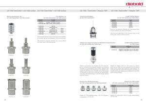 US 1100 TubeChiller© / US 1100 vertikal US 1100 TubeChiller® / US 1100 vertical US 1100 / TubeChiller© / Adapter TER US 1100 / TubeChiller ® / Adapter TER Werkzeugaufnahmen für Tool Adapters for Längeneinstelladapter Length Setting Adapter US 1100 TubeChiller® / US 1100 vertikal US 1100 TubeChiller ®/ US 1100 vertical für US 1100 TubeChiller® for US 1100 vertical and TubeChiller® Bestell-Nr. für Kegel Bestell-Nr. Kegel Order-No. for Taper Order-No. Taper 79.220.011 SK30/40 CAT30/40 BT30/40 79.240.040 HSK40 79.500.900.450 SK50 CAT50 BT50 (no picture) 79.240.050 HSK50 79.240.063 HSK63 79.360.325 HSK 25 79.240.080 HSK80 79.360.332 HSK32 / HSK-F40 79.240.100 HSK100 79.360.340 HSK 40 PSC479.360.350HSK50 / HSK-F63PSC579.360.363.01HSK63 / HSK-F80PSC6 Sicheres und einfaches Einstellen der Auskraglänge desFräseres während dem Schrumpfvorgang. 79.360.380 HSK80 (no picture) PSC879.360.390HSK100 Safe and easy adjustment of the overhang length of themilling cutter during the shrink process. 79.220.011 Werkzeugaufnahmen für kleine Werkzeug-Schnittstellen, für sicheren Halt der Schrumpffutter in der Zentrierscheibe. Tool holders for small tool interfaces, for a secure hold of the shrink chuck in the centering disc. Adapter mit Längenanschlag für TER Spannzangeneinsätze Length Setting Adapters für US 1100 vertikal und TubeChiller® for TER Collets Bestell-Nr. Ausführung Order-No. Type 79.TER.100 Adapter für TubeChiller® und US 1100 vertikalAdapter for TubeChiller® and US 1100 vertical 79.360.325 79.360.332 Adapter zur Aufnahme von Einsätzen für TER Spannzan- Adapter for holding inserts for TER collets in a vertical gen im vertikalen Schrumpfgerät. Sicheres und einfaches shrink device. Safe and easy adjustment of the desired Einstellen der Auskarglänge ihres Fräsers während dem length of your milling cutter during the shrink process. By Schrumpfvorgang für Schrumpfzangen. Der Adapter ist ein- turning the shaft, the inserted PIN is adjusted and serves as stellbar. Durch Drehen des Schaftes wird der eingesetzte a stop for the length adjustment of a cutting tool in the TER PIN verstellt und dient als Anschlag für die Längeneinstel- collets during shrinking. lung eines Schneidwerkzeugs in der TER Zange während 79.360.340 79.360.350 des Schrumpfens. Einsätze für TER Spannzangen Adapters for TER Collets US 1100 vertikal und für US 1100 TubeChiller® US 1100 vertical and for US 1100 TubeChiller® Bestell-Nr. Ausführung Order-No. Type 79.TER.111 TER11 79.TER.116 TER16 79.TER.120 TER20 79.TER.125 TER25 79.TER.132 TER32 Adapter für Schrumpfspannzangen (TER) für Längenan- Adapter for shrink collets (TER) for length setting adapter 79.360.363.01 79.360.390 schlagadapter (79.TER.100) (79.TER.100) 28 29