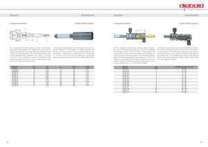 Druckdatum: 04.11.2011 11:20:19 / framalho 1 2 3 4 5 6 Zubehör Accessories Zubehör Accessories A A Längenmessadapter Length Setting Adapter Längeneinstellhülse Length Setting Sleeves L B B Die Längenvoreinstellung erfolgt vor dem Schrumpfvor- The length is preset before the shrinking process with the Mit der Längeneinstellhülse kann genau bestimmt werden, The length setting sleeve can be used to determine exactly gang mittels Messadapter (B). Dieser wird mit dem Werk- gauge adapter (B). The adapter is inserted together with wie weit die Schneidwerkzeuge aus dem Schrumpffutter how far the cutting tools will extend from the shrink chuck. zeug (C) zusammen in das Spannfutter (A) gesteckt. Durch the tool (C) into the chuck (A). By turning the adCapter, the herausragen sollen. Hierzu wird der Schiebestößel auf For this purpose, the slidinC g pin is adjusted to the desired Drehen des Messadapters wird die Werkzeuglänge über tool length is changed via an adjusting screw. The length das gewünschte Skalenmaß eingestellt und festgeklemmt. scale and clamped. The cutting tool is then guided into the die Anschlagschraube verändert. Die Länge L = 80 mm L = 80 mm (3.15 inch) must be subtracted. Remove the Dann wird das Schneidwerkzeug in die Bohrung geführt, tool holder bore. The inserted cutter stops at the defined (3.15 inch) muss verrechnet werden. Anschließend wird measuring adapter and shrink the tool to the preset length. gegen den Anschlag gedrückt und geklemmt. So wird der length. If the chucks have exact length, length setting in the der Messadapter entnommen und das Werkzeug auf diegewünschte Länge eingeschrumpft. FgeräfüsherrtSCNi.coinchpShuyttdrzbiogveahemftresmareßersterenekrKvrnedaahdncihitteeotDnzDIFNtINeIuSISOtSOt1e1c660rh0116er6bui!enamcehptegnfef! untFatrDeeIuiNmraIeSnmßaOtbiotctlhe2eLl7ira6snä8z-1enan guDOefINRbaAeISrhinfOlänµc1amh3es0b2ceMWdhniaevlßre,aksrstisgatsoebffte1di:1nie- 0P.o0si1tionmm ranGgeweichits12p8.o26s6 gsible.AbmaßeØ20x80 Längeneinstellung im 0.01 mm BeCArDe-Sicyshtemm: SöWgxl2i0c1h1 . Datum Name Benennung: Bestell-Nr.Order-No. Ød Ødmminch sw Länge LengthmminDch Bestell-Nr. Bearb. 29.01.09 HeimGepr.29.01.09RössLängenØedinstellhülse Ø6 Auskraglänge / Extruding LengthOrder-No.Normfür Schne[imdwme] rkzeugeL [mm] 79.230.06 6 0.24“ 2,5 80 3.15“ 79.237.03 3 5 – 25 79.230.08 8 0.30“ 3,0 80 3.15“79.230.10100.39“4,0803.15“ 79.237.032 Goldring-Werkzeugfabrik Artikel Nr.: 379.237.04An der Sägmühle 4D-72417 Jungingen79.237.0 46A4 30 – 50 5 – 25Blatt 79.230.12 12 0.47“ 5,0 80 3.15“ 1 2 Zust. Änd7er9un.g237.042Datum Name EDV Nr.: 79-237-XXX_Katalog Ersatz für 4 Ersetzt durch 1 von 1 30 – 50 79.230.14 14 0.55“ 5,0 80 3.15“ 79.237.05 5 5 – 25 79.230.16 16 0.63“ 6,0 80 3.15“ 79.237.052 5 30 – 50 79.230.18 18 0.71“ 6,0 80 3.15“ 79.237.06 6 10 – 35 79.230.20 20 0.79“ 8,0 80 3.15“ 79.237.062 6 35 – 60 79.230.25 25 0.98“ 8,0 80 3.15“ 79.237.08 8 10 – 35 79.230.32 32 1.26“ 8,0 80 3.15“ 79.237.082 8 35 – 60 79.237.10 10 15 – 50 79.237.102 10 35 – 60 79.237.12 12 15 – 50 79.237.16 16 30 – 65 36 37