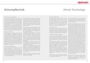 Schrumpftechnik Shrink Technology Erste Schritte: die offene Flamme First Steps: Welding Torch Die durch das Aufschrumpfen von Ringen und Parallel entwickelte die Fa. Marquart in Deutschand Open-flame heating units have been in use since By then the ThermoGrip™ Group covered roughly Lagern auf Wellen bekannte Erwärmungsmethode unter dem Namen Pyroquart® ein wesentlich klei- the beginning of the Industrial Revolution. The first 30 % of the ShrinkFit market worldwide and was an mit offener Flamme wurde bereits Ende der Achtziger- neres Gerät, das aber die gleiche Leistungsdichte documented application was to shrink iron rims onto indisputable leader in the field. Many innovations in jahre auch zum Einschrumpfen von Werkzeugen bereitstellen konnte. Diese Gerätelinie wurde im heat shrink wagon wheels. In time, this method this technology came from the ThermoGrip™Group verwendet. Dies beschränkte sich jedoch ausschließ- Jahr 2010 von Diebold, dem Mitbegründer der was used to heat rings and/or bearings onto shafts. and their leading experts. lich auf nichtwiederlösbare Verbindungen. Die erreich- ThermoGrip®- Gruppe, übernommen. Mit dem Eventually open-flames units were developed to baren Temperaturen und die durch die notwendige längsten Know-how der Branche in diesem Bereich heat ShrinkFit chucks using carbide tooling. These Diebold offers different Shrink Units for certain Erwärmungszeit in der Folge auftretende Aus- hatte die ThermoGrip®- Gruppe eine weltweite Spit- systems, as well as the venerable oxy-acetylene purposes. Starting with special crafted units to shrink dehnung machten dieses System im Bereich der zenstellung erreicht. torch remain in use in some shops to this day. mini tools for micro production up to powerful units Werkzugspannung nur sehr beschränkt einsetzbar. to shrink tools with big diameters for heavy cutting Ausschrumpfen von HM-Werkzeugen war nicht mehr Das Diebold´sche Portfolio bietet mittlerweile viele Second Step: Hot Air Diebold offers the suitable unit, either manual or möglich und vor allen Dingen die erhöhte Gefahr Schrumpfgeräte für die verschiedensten Anwen- Hot-air shrink units were offered as an alternative to with parameter sets for various steel types or fully durch offene Flammen ließen dieses System bereits dungen an. Angefangen bei Mikrowerkzeugen für open-flame units. The main drawback of hot-air was automatic units. These units also can shrink the Mitte der Neunzigerjahre wieder komplett sterben. die Feinstbearbeitung bis hin zu Werkzeugen für the time required to heat a chuck sufficiently to change lately introduced JetSleeveTM 2.0, now even easier die Schwerzerspanung kann mittlerweile jeder a cutting tool. It offered the opportunity to automate since the jet ring does not have to be removed any Zweiter Schritt: Heißluft Halter geschrumpft werden. the process to some degree, but this advantage was more during the shrink process. JetSleeveTM 2.0 is a Mit Einführung der im Industrie- und Heimwerker- Sogar der neu entwickelte JetSleeve® 2.0 kann dank not enough to overcome the limitations of cycle time. coolant through tool holder where coolant, air only bereich eingesetzten Heißluftpistolen Anfang der des aufgeschraubten Goldringes nun problem- or even MQL will be directly sprayed towards the Neunzigerjahre wurde das Verfahren mit der offenen los geschrumpft werden. Beim JetSleeve® 2.0 wird The Solution: Induction Technology cutter. Tiny little jets located at the holder end are Flamme abgelöst. Die Pistolen konnten vernünftig KSS oder nur Luft durch winzig kleine Düsen mitgespannt und die Wärmeerzeugung konnte kontrol-hohemDruckdirektandieSchneidegesprüht,liert gesteuert werden. In der Folge konnte zumindestdadurchwerdenentstehendeSpänesofortnachdas Einschrumpfen von HM-Werkzeugen sogar teil-Entstehen weggeblasen, ein Überfahren der Späneautomatisiert werden. Die Gefahr von Verletzungenist somit unmöglich. Dieses Verfahren ermöglichtdurch die Temperaturen sowie das eingeschränktenun ungeahnte Anwendungen und löst 90% allerEinsatzfeld in Bezug auf Werkzeugdurchmesser undFräsprobleme.–MaterialließenjedochauchdiesesSystemnachSchrumpfgeräte mit integrierter Kühlung erleichternbereits kurzer Zeit wieder vom Markt verschwinden.dasSchrumpfennochweiter.ErgänzendzudenHeute gibt es noch einen einzigen Anbieter, der die-vollautomatischen Schrumpfgeräten bietet Dieboldses System im Programm hat.auch separate Kühlgeräte an.IngesondertemProspektfindenSieeinbreitesDie Lösung: InduktionstechnikSpektrumanDiebold-Schrumpfaufnahmen,diezusammen mit den Diebold-Schrumpfgeräten eineMittederNeunzigerjahrebegannenzweiparalleloptimale Symbiose bilden. Diebold garantiert bestelaufendeEntwicklungen.IndenUSAwurdeeinSchrumpfergebnisse beiAnwendung von Diebold-InduktionsgerätfüreinenuniversellenEinsatzmitSchrumpfgerätundDiebold-Werkzeugaufnahme,offener Induktionsspule entwickelt. Aufgrund der da-dadieSchrumpfparameterexaktaufdieHaltermals nicht bekannten Bündelung von Magnetfedernabgestimmt sind.war die benötigte Energie und der dafür notwendigeGenerator etwa in der Größe eines Kleiderschrankes.DieboldgewährleistetdamitbestenSitzderIn1992aUS-CompanyobtainedapatentforShrinkFit tooling and for an inductive shrinking unit.The machine they introduced was very powerful butalso very large. That unit developed high power ina relatively undefined area while lead to overheatingtools.Atthesametime,MarquartinGermanywasdeveloping on their own system of inductive shrinkingand in 1994 they obtained an European Patent forThermGrip™ tooling and their own inductive machine.At first they concentrated on smaller cutting tools butgraduallyexpandedtheirproductrangetoalltoolholder sizes and form to most common sizes.During the late nineties the ThermoGrip™ Group wasformedbythecompaniesDiebold,Bilz,Marquartand Komet. They all manufactured ShrinkFit holdersusing design specifications first introduced by DieboldGmbHfortheirThermoGrip