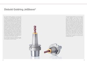 Diebold Goldring JetSleeve® Der Diebold Goldring JetSleeve® 2.0 ist die zweite The Diebold Goldring JetSleeve™ 2.0 is the revolution Revolution in der Fräsbearbeitung. Eine klassische in milling. JetSleeve™ 2.0 shrink fit tool holders Fräsaufnahme wurde dahingehend modifiziert, dass have the capability to spray coolant, air or MQL nun durch das Werkzeug KSS, MMS oder nur Luft directly to the cutter shank. The medium is sprayed an die Fräserspitze gesprüht wird. Die Verteilung des through the Goldring at the nose part of the tool Mediums geschieht über einen Goldring, ähnlich eines holder. The ring has small nozzles that accelerate Eheringes, der auf die Stirnseite des Fräsers aufge- the coolant running through the tool holder. Chips are schraubt wird. Der Ring ist mit 16 winzigen Düsen blown away from the cutting area immediately after in verschiedenen Anordnungen versehen, durch die break, so it is impossible to overrun the chips. This das Medium mit hoher Geschwindigkeit gesprüht wird. will increase milling cutter life by up to 300 %, which is Entstehende Späne werden sofort nach Bruch wegge- particularly advantageous when cutting in pockets or sprüht, ein Überfahren der Späne ist daher unmöglich. deep cavities. Contours can be milled instead of EDM Diese Vorgehensweise erhöht die Fräserstandzeit um with the need to first produce electrodes and then bis zu 300 %, was besonders in tiefen Löchern und EDM on a separate machine. With the use of Diebold Kavitäten von großem Vorteil ist. Das Anfertigen von Goldring JetSleeve™ 2.0 unmanned machining is Elektroden und Erodieren ist dann nicht mehr notwen- possible since no cutter breakage is to be expected. dig, das Werkstück kann in einem Arbeitsdurchgang Interruption of a milling process in mould making is ohne Technologienwechsel bearbeitet werden. Mit dem very cost-intense. Using JetSleeve™ 2.0 tool holders Diebold Goldring JetSleeve® 2.0 können nun mannlose re-entry into the milling program after milling cutter Schichten gefahren werden, da kein Fräserbruch zu breakage or early cutter wear is no longer necessary. erwarten ist. Somit entfällt auch der zeitintensive und The Goldring does not have to be removed for the meist kritische Wiedereinstieg in das Fräsprogramm shrinking process. JetSleeve™ 2.0 can be used on nach Fräserbruch oder frühem Verschleiß. all Diebold shrink units. Zum Schrumpfen braucht der Goldring nicht abge- nommen werden. Schrumpfen ist mit allen Diebold- Schrumpfgeräten problemlos möglich. 42 43