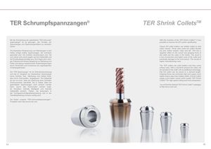 TER Schrumpfspannzangen® TER Shrink ColletsTM Mit der Entwicklung der patentierten TER-Schrumpf- With the invention of the TER Shrink ColletsTM it was spannzange® ist es gelungen, den Einsatz von possible to improve the ER system significantly. Spannzangen und Spannzangenfuttern zu revolutio- nieren. Classic ER collet holders use slotted collets to hold cutter shanks. These slots make the collets flexible Die klassische Einspannung von Werkzeugen in den but also collect coolant, chips and dirt. This has a Halter erfolgt mittels Spannzangen, die mehrfach negative effect on the runout and gripping force of geschlitzt sind. Die Schlitze verschmutzen zum Teil the collet and the cutter in the holder. The result is und wirken sich somit negativ auf die Haltekräfte und a loss of precision and higher ware of the cutter and die Rundlaufeigenschaften aus. Die Folgen sind: weni- eventually damage to the work pieces. This results in ger Präzision bei höherer Belastung von Werkzeug und higher manufacturing costs. Futter und daraus resultierenden Kostensteigerungen durch Verschleiß und Ausschuss bei ungenügenden The TER collets are solid holders and they come Arbeitsergebnissen. without slots. With a ShrinkFit process the cutter will be clamped in the collet with an additional advantage, Die TER-Spannzange® ist ein Monoblockwerkzeug that the cutter can be preset to a desired length. und hat im Vergleich zur klassischen Spannzange Gripping forces are extremely high and supply much keine Schlitze. Das Werkzeug wird mittels Hitze, higher torque rates than slotted collets. Shrink Collets also durch Schrumpfen, eingespannt. Die Haltekraft supply much better runout which qualify TER Shrink ist nun so hoch, dass die Spannung auch höchsten ColletsTM for high speed milling and micro production. Drehmomenten standhält, die in dieser Güte bei geschlitzten Spannzangen nicht erreicht werden You will find the Diebold TER Shrink ColletTM catalogue kann. Durch das Schrumpfen werden exak- at http://www.hsk.com. ter Rundlauf, höchste Steifigkeit und höchste Haltekräfte erreicht, Fakten, die besonders in der Hochgeschwindigkeitsbearbeitung und in der Feinstbearbeitung immens wichtig sind. Sie finden unseren TER-Schrumpfspannzangen®- Prospekt unter http://www.hsk.com. 44 45