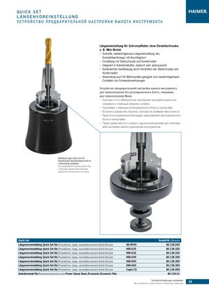 QUICK SET LÄNGENVOREINSTELLUNG УСТРОЙСТВО ПРЕДВАРИТЕЛЬНОЙ НАСТРОЙКИ ВЫЛЕТА ИНСТРУМЕНТА Längeneinstellung für Schrumpffutter ohne Einstellschraube, z. B. Mini Shrink –– Schnelle, wiederholgenaue Längeneinstellung des Komplettwerkzeugs mit Anschlagdorn –– Einstellung mit Stellschraube und Kontermutter –– Integriert in Aufnahmehalter, dadurch sehr platzsparend –– Kinderleichte Handhabung durch Verdrehen der Stellschraube und Kontermutter –– Anwendung auch für Mehrspindler geeignet zum wiederholgenauen Einstellen von Schwesterwerkzeugen Устройство предварительной настройки вылета инструмента для термопатронов без регулировочного болта, например, для термопатронов Мини –– Быстрая и со стабильностью повторения настройка вылета ин- струмента с помощью упорного штифта –– Настройка с помощью регулировочного болта и контргайки –– Встроен в держатель патрона, поэтому не занимает много места –– Простота в управлении благодаря закручиванию регулировочного болта и контргайки –– Также применяется в станках с мульти-шпинделями для повторяе- мой настройки вылета однотипных инструментов Abbildung zeigt: Quick Set mit Aufnahmetopf (Aufnahmetopf nicht im Lieferumfang enthalten) На изображении показана Quick Set c базовым держателем (базовый держатель не включен в поставку) Quick Set Bestell-Nr./Артикул Längenvoreinstellung Quick Set für/Устройство пред. настройки вылета Quick Set для SK/BT4080.136.240 Längenvoreinstellung Quick Set für/Устройство пред. настройки вылета Quick Set для HSK-E25 80.136.325 Längenvoreinstellung Quick Set für/Устройство пред. настройки вылета Quick Set для HSK-E32 80.136.332 Längenvoreinstellung Quick Set für/Устройство пред. настройки вылета Quick Set для HSK-E40 80.136.340 Längenvoreinstellung Quick Set für/Устройство пред. настройки вылета Quick Set для HSK-E50 80.136.350 Längenvoreinstellung Quick Set für/Устройство пред. настройки вылета Quick Set для HSK-A63 80.136.363 Längenvoreinstellung Quick Set für/Устройство пред. настройки вылета Quick Set для Capto C5 80.136.450 Aufnahmetopf für/Базовый держатель для Power Clamp Basic/Economic/Economic Plus 80.155.01 Technische Änderungen vorbehaltenМы оставляем за собой право на технические изменения29