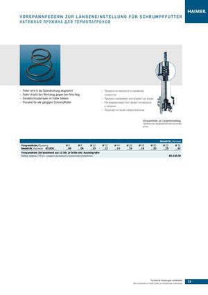 VORSPANNFEDERN ZUR LÄNGENEINSTELLUNG FÜR SCHRUMPFFUTTER НАТЯЖНАЯ ПРУЖИНА ДЛЯ ТЕРМОПАТРОНОВ –– Feder wird in die Spannbohrung eingesetzt –– Пружина вставляется в зажимное –– Feder drückt das Werkzeug gegen den Anschlag отверстие –– Einstellschraube kann im Futter bleiben –– Пружина прижимает инструмент до упора –– Passend für alle gängigen Schrumpffutter –– Регулировочный болт может оставаться в патроне –– Подходит ко всем термопатронам Vorspannfeder zur Längeneinstellung Пружина для предварительной настройки длины Bestell-Nr./Артикул Vorspannfeder/Пружина Ø6 Ø8 Ø 10 Ø 12 Ø 14 Ø 16 Ø 18 Ø 20 Ø 25 Ø 32 Bestell-Nr./Артикул 85.830… …06 …08 …10 …12 …14 …16 …18 …20 …25 …32 Vorspannfeder Set bestehend aus 10 Stk. je Größe inkl. Ausziehgreifer Набор пружин (10 шт. каждого размера) и захватное устройство 85.830.00 Technische Änderungen vorbehaltenМы оставляем за собой право на технические изменения33