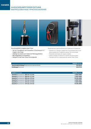AUSSCHRUMPFVORRICHTUNG ВЫПРЕССОВОЧНОЕ ПРИСПОСОБЛЕНИЕ Ausschrumpfhilfe für abgebrochene Fräser. Выпресовочное приспособление для сломанных инструментов. –– Set mit 1 Grundkörper und 6 Auswerfern (3 Durchmesser in 2 –– Комплект из 1 базового держателя и 6 выталкивателей (3 раз- Längen), ohne Zange личных диаметра в 2 вариантах длины), без пассатижей –– Unterlage aus Gummi zum Schutz der Werkzeugaufnahme –– Резиновая прокладка для защиты оправки –– Mit Einlageplatte für Schwenkfach –– Панель-вкладыш вставляется в ящички для аксессуаров –– Geeignet für alle Power Clamp Schrumpfg eräte –– Подходит для всех термоусадочных машин Power Clamp Bestell-Nr./Артикул Ausschrumpfvorrichtung/Выпресовочное приспособление80.126.00 Kombizange/Пассатижи 80.107.00 Zubehör/АксессуарыBestell-Nr./Артикул Auswerfer/Выталкиватель 200 mm x 2,3 mm 113027–0004 Auswerfer/Выталкиватель 200 mm x 4,7 mm 113027–0005 Auswerfer/Выталкиватель 200 mm x 5,5 mm 911001–0002 Auswerfer/Выталкиватель 315 mm x 2,3 mm 113027–0007 Auswerfer/Выталкиватель 315 mm x 4,7 mm 113027–0008 Auswerfer/Выталкиватель 315 mm x 5,5 mm 911001–0003 34 Technische Änderungen vorbehaltenМы оставляем за собой право на технические изменения