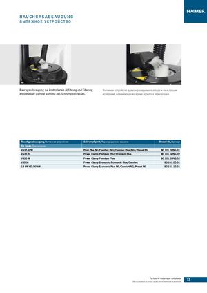 RAUCHGASABSAUGUNG ВЫТЯЖНОЕ УСТРОЙСТВО Rauchgasabsaugung zur kontrollierten Abführung und Filterung Вытяжное устройство для контролируемого отвода и фильтрации entstehender Dämpfe während des Schrumpfprozesses. испарений, возникающих во время процесса термоусадки. Rauchgasabsaugung/Вытяжное устройство Schrumpfgerät/Термоусадочная машина Bestell-Nr./Артикул für Spule/Для катушки VS32-H/M Profi Plus NG/Comfort (NG)/Comfort Plus (NG)/Preset NG 80.101.02NG.01 VS32-H Power Clamp Premium (NG)/Premium Plus 80.101.02NG.02 VS32-M Power Clamp Premium Plus 80.101.03NG.02 V2008 Power Clamp Economic/Economic Plus/Comfort 80.151.00.01 13 kW HD/20 kW Power Clamp Economic Plus NG/Comfort NG/Preset NG 80.151.10.01 Technische Änderungen vorbehaltenМы оставляем за собой право на технические изменения37