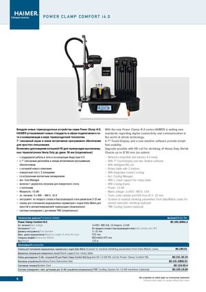 POWER CLAMP COMFORT i4.0 Внедряя новые термоусадочные устройства серии Power Clamp i4.0, With the new Power Clamp i4.0 series HAIMER is setting new HAIMER устанавливает новые стандарты в сфере подключения к се- standards regarding digital connectivity and communication in ти и коммуникации в мире термоусадочной технологии. the world of shrink technology. 7“ сенсорный экран и новое интуитивное программное обеспечение A 7“-Touch-Display and a new intuitive software provide simpli- для простого пользования. fied usability. Возможно дооснащение катушкой HD для термоусадки высокомощ- Upgrade possible with HD coil for shrinking of Heavy Duty Shrink ных термопатронов Heavy Duty до диам. 50 мм (опционально) Chucks up to Ø 50 mm (on option) –– c поддержкой работы в сети и по концепции Индустрия 4.0 –– Network-compatible and industry 4.0-ready –– c 7“ сенсорным дисплейем и новым интуитивным программным –– With 7“-Touch-Display and new intuitive software обеспечением –– With intelligent NG coil –– c катушкой нового поколения –– Rotary table with 3 stations –– поворотный стол с 3 позициями –– With integrated contact cooling –– cо встроенным контактным охлаждением –– Incl. Cooling Manager –– вкл. Cool Manager –– With 1 chuck support for rotary table –– включая 1 держатель патронов для поворотного стола –– With craning boxes –– c полочками –– Power: 13 kW –– Мощность: 13 кВт –– Mains voltage: 3 x 400 – 480 V, 16 A –– эл. питание: 3 х 400 – 480 V, 16 А –– Tools: solid carbide and HSS from Ø 3 – 32 mm –– инструмент: из твердого сплава и быстрорежущей стали диаметром 3-32 мм –– Scanner to readout shrinking parameters from Data-Matrix codes for –– сканер для считывания индукционных параметров с кодов Data-Matrix для easiest automatic shrinking (optional) простой и автоматизированной термоусадки (опционально) –– TME Cooling System (optional) –– система охлаждения с датчиками TME (опционально) Технические данные/Technical details Артикул/Order No. Power Clamp Comfort i4.0 80.100.20NG.3 Эл. питаниеMains voltage 3 x 400 – 480 Volt, 16 Ampere, 13 kW Инструмент/Tools Из твердого сплава и быстрорежущей стали/solid carbide and HSS Диаметр инструмента/Tool diameter 3 – 32 mm Макс. длина термопатрона/Maximum Length of shrink fit chuck 570 mm Габариты ШхДхВ/Dimensions WxDxH 850 x 660 x 970 mm Вес/Weight 115 кг Аксесуары/Accessories Сканер для считывания индукционных параметров с кодов Data-Matrix Scanner to readout shrinking parameters from Data-Matrix codes 80.185.01 Держатель патрона для поворотного стола/Chuck support for rotary table Набор дооснащения 13 кВт. катушкой HD для Power Clamp Comfort NG/Upgrade Kit 13 kW HD coil for Power Clamp Comfort NG 80.151.30.10 Вытяжное устройство/Auxiliary Fume Extraction Unit 80.101.02NG.01 Системная тележка/System Cart 80.124.00.4 Система охлаждения с темп. датчиками для 13 кВт устройства (опционально)/TME Cooling System for 13 kW machines (optional) 80.105.19.00 6 Мы оставляем за собой право на технические измененияTechnical data subject to change without prior notice