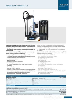 POWER CLAMP PRESET i4.0 Внедряя новые термоусадочные устройства серии Power Clamp i4.0, HAIMER With the new Power Clamp i4.0 series HAIMER is setting new устанавливает новые стандарты в сфере подключения к сети и коммуникации standards regarding digital connectivity and communication in в мире термоусадочной технологии. the world of shrink technology. 7“ сенсорный экран и новое интуитивное программное обеспечение для про- A 7“-Touch-Display and a new intuitive software provide simpli- стого пользования. fied usability. Возможно дооснащение катушкой HD для термоусадки высокомощных термо- Upgrade possible with HD coil for shrinking of Heavy Duty Shrink патронов Heavy Duty до диам. 50 мм (опционально) Chucks up to Ø 50 mm (on option) –– c поддержкой работы в сети и по концепции Индустрия 4.0 –– Network-compatible and industry 4.0-ready –– c 7“ сенсорным дисплейем и новым интуитивным программным обеспечением –– With 7“-Touch-Display and new intuitive software –– c вертикальным упором для регулировки длины –– With vertical stop for length presetting –– c катушкой нового поколения –– With intelligent NG coil –– одноместная система –– Single chuck version –– cо встроенным контактным охлаждением –– With integrated contact cooling –– вкл. Cool Manager –– Incl. Cooling Manager –– вкл. 2 прециз. базовых держателя и 2 прециз. держателя патрона –– With 2 precision base holders and 2 precision chuck supports –– c полочками –– With craning boxes –– Мощность: 13 кВт –– Power: 13 kW –– эл. питание: 3 х 400 – 480 V, 16 А –– Mains voltage: 3 x 400 – 480 V, 16 A –– инструмент: из твердого сплава и быстрорежущей стали диаметром 3-32 мм –– Tools: solid carbide and HSS from Ø 3 – 32 mm –– cканер для считывания индукционных параметров с кодов Data-Matrix для –– Scanner to readout shrinking parameters from Data-Matrix codes for простой и автоматизированной термоусадки (опционально) easiest automatic shrinking (optional) –– система охлаждения с датчиками TME (опционально) –– TME Cooling System (optional) Технические данные/Technical details Артикул/Order No. Power Clamp Preset i4.0 80.130.20NG.3 Эл. питаниеMains voltage 3 x 400 – 480 Volt, 16 Ampere, 13 kW Инструмент/Tools Из твердого сплава и быстрорежущей стали/solid carbide and HSS Диаметр инструмента/Tool diameter 3 – 32 mm Макс. длина термопатрона/Maximum Length of shrink fit chuck 570 mm Габариты ШхДхВ/Dimensions WxDxH 860 x 660 x 970 mm Вес/Weight 115 кг Аксесуары/Accessories Сканер для считывания индукционных параметров с кодов Data-Matrix Scanner to readout shrinking parameters from Data-Matrix codes 8 0.185.01 Прецизионный держатель патрона/Precision chuck support Набор дооснащения 13 кВт. катушкой HD для Power Clamp Comfort NG/Upgrade Kit 13 kW HD coil for Power Clamp Comfort NG 80.151.30.10 Вытяжное устройство/Auxiliary Fume Extraction Unit 80.101.02NG.01 Системная тележка/System Cart 80.124.00.4 Система охлаждения с темп. датчиками для 13 кВт устройства (опционально)/TME Cooling System for 13 kW machines (optional) 80.105.19.00 Мы оставляем за собой право на технические измененияTechnical data subject to change without prior notice7