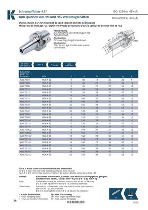 Schrumpffutter 4,5° ISO 12164 (HSK-A) zum Spannen von HM und HSS Werkzeugschäften DIN 69893 (HSK-A) Shrink chucks 4,5° for mounting of solid carbide and HSS-tool shanks Mandrins de frettage 4,5° pour le serrage de queues d‘outils carbures de type HM et HSS Verwendung: Zur Aufnahme von Werkzeugen mit Zylinderschaft. Application: For mounting straight-shank tools. Application: Pour le serrage d’outils avec queue cylindrique. ISO 12164-1(DIN 69893-1)HSK - A ≤ 0,003 G2,525.000 min-1 Bestell-Nr. Order no. Référence HSK d A D D1 l1 l2 A80.70.04 HSK-A 80 4 80 14 22 20 5 A80.70.06 HSK-A 80 6 85 21 27 36 10 A80.70.08 HSK-A 80 8 85 21 27 36 10 A80.70.10 HSK-A 80 10 90 24 32 42 10 A80.70.12 HSK-A 80 12 95 24 32 47 10 A80.70.14 HSK-A 80 14 95 27 34 47 10 A80.70.16 HSK-A 80 16 100 27 34 50 10 A80.70.18 HSK-A 80 18 100 33 42 50 10 A80.70.20 HSK-A 80 20 105 33 42 52 10 A80.70.25 HSK-A 80 25 115 44 53 58 10 A80.70.32 HSK-A 80 32 120 44 53 61 10 A80.70.06.1 HSK-A 80 6 120 21 27 36 10 A80.70.08.1 HSK-A 80 8 120 21 27 36 10 A80.70.10.1 HSK-A 80 10 120 24 32 41 10 A80.70.12.1 HSK-A 80 12 120 24 32 47 10 A80.70.14.1 HSK-A 80 14 120 27 34 47 10 A80.70.06.2 HSK-A 80 6 160 21 27 36 10 A80.70.08.2 HSK-A 80 8 160 21 27 36 10 A80.70.10.2 HSK-A 80 10 160 24 32 41 10 A80.70.12.2 HSK-A 80 12 160 24 32 47 10 A80.70.14.2 HSK-A 80 14 160 27 34 47 10 A80.70.16.2 HSK-A 80 16 160 27 34 50 10 A80.70.18.2 HSK-A 80 18 160 33 42 50 10 A80.70.20.2 HSK-A 80 20 160 33 42 52 10 A80.70.25.2 HSK-A 80 25 160 44 53 58 10 Für Ø 3, 4 und 5 mm nur Hartmetallschäfte verwenden For Ø 3, 4 and 5 mm only solid carbide tool shanks must be used Pour Ø 3, 4 et 5 mm il faut seulement utiliser de queues d‘outils carbures de type HM Hinweis: Aufnahmen für Induktiv-, Kontakt- und Heißluftschrumpfgeräte geeignet. Schafttoleranz bei Ø 3, 4 und 5 mm = h4, bei Ø 6 – Ø 32 mm = h6 Note: Toolholders suitable for induction-, contact- and hot air shrink units. Ø 3, 4, 5 with h4-tolerance and Ø 6 – Ø 32 with h6-tolerance Observation: Porte-outils convenables pour machines à fretter par induction-, par contact-, ou par air chaud. Ø 3, 4, 5 avec h4-tolerance et Ø 6 – Ø 32 avec h6-tolerance l1 = max. Einstecktiefe l2 = max. Verstellweg l1 = max. clamping depth l2 = max. length adjustment range26l1 = max. profondeur d’insertionl2 = max. course de réglage4244 2020