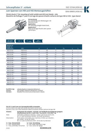 Schrumpffutter 3° - schlank ISO 12164 (HSK-A) zum Spannen von HM und HSS Werkzeugschäften DIN 69893 (HSK-A) Shrink chucks 3° for mounting of solid carbide and HSS-tool shanks - slim Mandrins de frettage 3° pour le serrage de queues d‘outils carbures de type HM et HSS - type élancé Verwendung: Zur Aufnahme von Werkzeugen mit Zylinderschaft. Application: For mounting straight-shank tools. Application: Pour le serrage d’outils avec queue cylindrique. ISO 12164-1(DIN 69893-1)HSK - A ≤ 0,003 G2,525.000 min-1 Bestell-Nr. Order no. Référence HSK d A D D1 l1 l2 A63.72.03 HSK-A 63 3 80 9 15,5 6 – A63.72.03.1 HSK-A 63 3 120 9 19,5 6 – A63.72.04 HSK-A 63 4 80 10 16,5 8 – A63.72.04.1 HSK-A 63 4 120 10 20,5 8 – A63.72.05 HSK-A 63 5 80 11 17,5 10 – A63.72.05.1 HSK-A 63 5 120 11 21,5 10 – A63.72.06 HSK-A 63 6 80 12 18,5 36 10 A63.72.06.1 HSK-A 63 6 120 12 22,5 36 10 A63.72.06.2 HSK-A 63 6 160 12 26,5 36 10 A63.72.08 HSK-A 63 8 80 14 20,5 36 10 A63.72.08.1 HSK-A 63 8 120 14 24,5 36 10 A63.72.08.2 HSK-A 63 8 160 14 28,5 36 10 A63.72.10 HSK-A 63 10 80 16 22,5 42 10 A63.72.10.1 HSK-A 63 10 120 16 26,5 42 10 A63.72.10.2 HSK-A 63 10 160 16 30,5 42 10 A63.72.12 HSK-A 63 12 80 18 24,5 47 10 A63.72.12.1 HSK-A 63 12 120 18 28,5 47 10 A63.72.12.2 HSK-A 63 12 160 18 32,5 47 10 Ausführung: schlanke Bauform (reduzierte Störkontur) Version: slim design (reduced interference contour) Version: Modèle très étroit (encombrement réduit) Für Ø 3, 4 und 5 mm nur Hartmetallschäfte verwenden For Ø 3, 4 and 5 mm only solid carbide tool shanks must be used Pour Ø 3, 4 et 5 mm il faut seulement utiliser de queues d‘outils carbures de type HM Hinweis: Aufnahmen für Induktiv-, Kontakt- und Heißluftschrumpfgeräte geeignet. Schafttoleranz bei Ø 3, 4 und 5 mm = h4, bei Ø 6 – Ø 32 mm = h6 Note: Toolholders suitable for induction-, contact- and hot air shrink units. Ø 3, 4, 5 with h4-tolerance and Ø 6 – Ø 32 with h6-tolerance Observation: Porte-outils convenables pour machines à fretter par induction-, par contact-, ou par air chaud. Ø 3, 4, 5 avec h4-tolerance et Ø 6 – Ø 32 avec h6-tolerance l1 = max. Einstecktiefe l2 = max. Verstellweg l1 = max. clamping depth l2 = max. length adjustment rangel1 = max. profondeur d’insertionl2 = max. course de réglage4244 31 2020