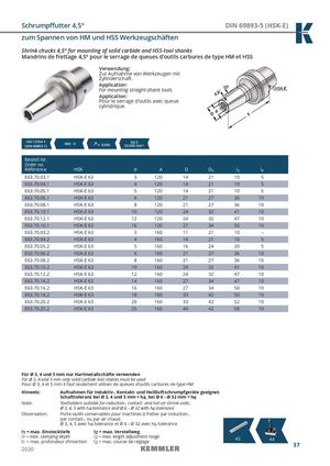 Schrumpffutter 4,5° DIN 69893-5 (HSK-E) zum Spannen von HM und HSS Werkzeugschäften Shrink chucks 4,5° for mounting of solid carbide and HSS-tool shanks Mandrins de frettage 4,5° pour le serrage de queues d‘outils carbures de type HM et HSS Verwendung: Zur Aufnahme von Werkzeugen mit Zylinderschaft. Application: For mounting straight-shank tools. Application: Pour le serrage d’outils avec queue cylindrique. ISO 12164-1(DIN 69893-1)HSK - E ≤ 0,003 G2,525.000 min-1 Bestell-Nr. Order no. Référence HSK d A D D1 l1 l2 E63.70.03.1 HSK-E 63 3 120 14 21 10 5 E63.70.04.1 HSK-E 63 4 120 14 21 10 5 E63.70.05.1 HSK-E 63 5 120 14 21 10 5 E63.70.06.1 HSK-E 63 6 120 21 27 36 10 E63.70.08.1 HSK-E 63 8 120 21 27 36 10 E63.70.10.1 HSK-E 63 10 120 24 32 41 10 E63.70.12.1 HSK-E 63 12 120 24 32 47 10 E63.70.16.1 HSK-E 63 16 120 27 34 50 10 E63.70.03.2 HSK-E 63 3 160 11 21 10 – E63.70.04.2 HSK-E 63 4 160 14 21 10 5 E63.70.05.2 HSK-E 63 5 160 16 24 20 5 E63.70.06.2 HSK-E 63 6 160 21 27 36 10 E63.70.08.2 HSK-E 63 8 160 21 27 36 10 E63.70.10.2 HSK-E 63 10 160 24 32 41 10 E63.70.12.2 HSK-E 63 12 160 24 32 47 10 E63.70.14.2 HSK-E 63 14 160 27 34 47 10 E63.70.16.2 HSK-E 63 16 160 27 34 50 10 E63.70.18.2 HSK-E 63 18 160 33 42 50 10 E63.70.20.2 HSK-E 63 20 160 33 42 52 10 E63.70.25.2 HSK-E 63 25 160 44 42 58 10 Für Ø 3, 4 und 5 mm nur Hartmetallschäfte verwenden For Ø 3, 4 and 5 mm only solid carbide tool shanks must be used Pour Ø 3, 4 et 5 mm il faut seulement utiliser de queues d‘outils carbures de type HM Hinweis: Aufnahmen für Induktiv-, Kontakt- und Heißluftschrumpfgeräte geeignet. Schafttoleranz bei Ø 3, 4 und 5 mm = h4, bei Ø 6 – Ø 32 mm = h6 Note: Toolholders suitable for induction-, contact- and hot air shrink units. Ø 3, 4, 5 with h4-tolerance and Ø 6 – Ø 32 with h6-tolerance Observation: Porte-outils convenables pour machines à fretter par induction-, par contact-, ou par air chaud. Ø 3, 4, 5 avec h4-tolerance et Ø 6 – Ø 32 avec h6-tolerance l1 = max. Einstecktiefe l2 = max. Verstellweg l1 = max. clamping depth l2 = max. length adjustment rangel1 = max. profondeur d’insertionl2 = max. course de réglage4244 37 2020