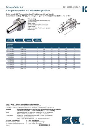 Schrumpffutter 4,5° DIN 69893-6 (HSK-F) zum Spannen von HM und HSS Werkzeugschäften Shrink chucks 4,5° for mounting of solid carbide and HSS-tool shanks Mandrins de frettage 4,5° pour le serrage de queues d‘outils carbures de type HM et HSS Verwendung: Zur Aufnahme von Werkzeugen mit Zylinderschaft. Application: For mounting straight-shank tools. Application: Pour le serrage d’outils avec queue cylindrique. ISO 12164(DIN 69893) HSK - F ≤ 0,003 G2,525.000 min-1 Bestell-Nr. Order no. Référence HSK d A D D1 l1 l2 F63.70.03.2 HSK-F 63 3 160 16 22 20 5 F63.70.04.2 HSK-F 63 4 160 16 22 20 5 F63.70.05.2 HSK-F 63 5 160 16 22 20 5 F63.70.06.2 HSK-F 63 6 160 21 27 36 10 F63.70.08.2 HSK-F 63 8 160 21 27 36 10 F63.70.10.2 HSK-F 63 10 160 24 32 42 10 F63.70.12.2 HSK-F 63 12 160 24 32 47 10 F63.70.14.2 HSK-F 63 14 160 27 34 47 10 F63.70.16.2 HSK-F 63 16 160 27 34 50 10 F63.70.18.2 HSK-F 63 18 160 33 42 50 10 F63.70.20.2 HSK-F 63 20 160 33 42 52 10 Für Ø 3, 4 und 5 mm nur Hartmetallschäfte verwenden For Ø 3, 4 and 5 mm only solid carbide tool shanks must be used Pour Ø 3, 4 et 5 mm il faut seulement utiliser de queues d‘outils carbures de type HM Hinweis: Aufnahmen für Induktiv-, Kontakt- und Heißluftschrumpfgeräte geeignet. Schafttoleranz bei Ø 3, 4 und 5 mm = h4, bei Ø 6 – Ø 32 mm = h6 Note: Toolholders suitable for induction-, contact- and hot air shrink units. Ø 3, 4, 5 with h4-tolerance and Ø 6 – Ø 32 with h6-tolerance Observation: Porte-outils convenables pour machines à fretter par induction-, par contact-, ou par air chaud. Ø 3, 4, 5 avec h4-tolerance et Ø 6 – Ø 32 avec h6-tolerance l1 = max. Einstecktiefe l2 = max. Verstellweg l1 = max. clamping depth l2 = max. length adjustment rangel1 = max. profondeur d’insertionl2 = max. course de réglage4244 39 2020