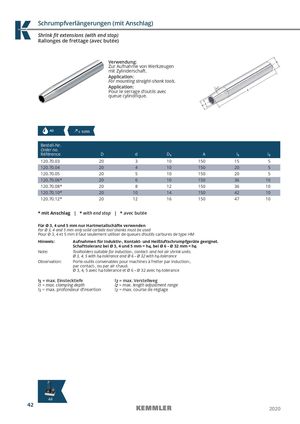 Schrumpfverlängerungen (mit Anschlag) Shrink fit extensions (with end stop) Rallonges de frettage (avec butée) Verwendung: Zur Aufnahme von Werkzeugen mit Zylinderschaft. Application: For mounting straight-shank tools. Application: Pour le serrage d’outils avec queue cylindrique. AD ≤ 0,003 Bestell-Nr. Order no. Référence D d D1 A l1 l2 120.70.03 20 3 10 150 15 5 120.70.04 20 4 10 150 20 5 120.70.05 20 5 10 150 20 5 120.70.06* 20 6 10 150 36 10 120.70.08* 20 8 12 150 36 10 120.70.10* 20 10 14 150 42 10 120.70.12* 20 12 16 150 47 10 * mit Anschlag | * with end stop | * avec butée Für Ø 3, 4 und 5 mm nur Hartmetallschäfte verwenden For Ø 3, 4 and 5 mm only solid carbide tool shanks must be used Pour Ø 3, 4 et 5 mm il faut seulement utiliser de queues d‘outils carbures de type HM Hinweis: Aufnahmen für Induktiv-, Kontakt- und Heißluftschrumpfgeräte geeignet. Schafttoleranz bei Ø 3, 4 und 5 mm = h4, bei Ø 6 – Ø 32 mm = h6 Note: Toolholders suitable for induction-, contact- and hot air shrink units. Ø 3, 4, 5 with h4-tolerance and Ø 6 – Ø 32 with h6-tolerance Observation: Porte-outils convenables pour machines à fretter par induction-, par contact-, ou par air chaud. Ø 3, 4, 5 avec h4-tolerance et Ø 6 – Ø 32 avec h6-tolerance l1 = max. Einstecktiefe l2 = max. Verstellweg l1 = max. clamping depth l2 = max. length adjustment range l1 = max. profondeur d’insertion l2 = max. course de réglage 1404.27 42 2020