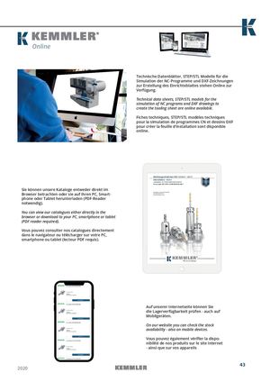 Online Technische Datenblätter, STEP/STL Modelle für die Simulation der NC-Programme und DXF-Zeichnungen zur Erstellung des Einrichteblattes stehen Online zur Verfügung. Technical data sheets, STEP/STL models for the simulation of NC programs and DXF drawings to create the tooling sheet are online available. Fiches techniques, STEP/STL modèles techniques pour la simulation de programmes CN et dessins DXF pour créer la feuille d‘installation sont disponible online. Sie können unsere Kataloge entweder direkt im Browser betrachten oder sie auf Ihren PC, Smart- phone oder Tablet herunterladen (PDF-Reader notwendig). You can view our catalogues either directly in the browser or download to your PC, smartphone or tablet (PDF reader required). Vous pouvez consulter nos catalogues directement dans le navigateur ou télécharger sur votre PC, smartphone ou tablet (lecteur PDF requis). Auf unserer Internetseite können Sie die Lagerverfügbarkeit prüfen - auch auf Mobilgeräten. On our website you can check the stock availability - also on mobile devices. Vous pouvez également vérifier la dispo- nibilité de nos produits sur le site Internet - ainsi que sur vos appareils 43 2020