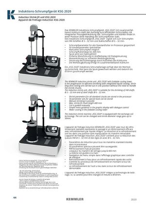 Induktions-Schrumpfgerät KSG 2020 Induction Shrink-fit unit KSG 2020 Appareil de frettage induction KSG 2020 Das KEMMLER Induktions-Schrumpfgerät „KSG 2020“ mit zusammenfalt- barem Kühlturm stellt den Aufstieg zum effizienten Schrumpfen mit integrierter Flüssigkeitskühlung dar. Schrumpfen und Kühlen findet in einer Position ohne Handling der Schrumpffutter statt. Das Induktions-Schrumpfgerät „KSG 2020“ eignet sich zum Schrumpfen von HM-Schäften Ø 3 – 32 mm und Stahlschäften Ø 6 – 32 mm. • Schrumpfparameter für alle Standardfutter im Prozessor gespeichert • 50 Sonderparameter speicherbar • Manuelles Schrumpfen möglich • Schrumpffutterlänge bis 400 mm • Spule wird von Hand geführt • Einfache Menüführung im Grafikdisplay mit Dialogsteuerung • Wasserkühlung zur schnellen Werkzeugkühlung • Steuerung des Kühlvorgangs durch Aufziehen des Kühlturms • Die Werkzeugkühlung erfolgt im zusammenfaltbaren Kühlturm Die „KSG 2020“ Induktions-Schrumpfanlage verfügt über die Wechsel- spulentechnik. Hier kann die Spule gewechselt werden und dadurch bis Ø50mm geschrumpft werden. The KEMMLER induction shrink unit „KSG 2020“ with foldable cooling tower is the progression to efficient shrinking with integrated liquid cooling. Shrin- king and cooling are carried out in one position without the need to handle the shrink chucks. The induction shrink unit „KSG 2020“ is suitable for the shrinking of HM shafts Ø 3 – 32 mm and of steel shafts Ø 6 – 32 mm. • Shrink parameters for all standard chucks are stored in the processor • 50 parameter sets for special tools can be stored • Manual shrinking is possible • Max. shrink-fit chuck length 400 mm • Coil is guided manually • Simple menu guidance in the graphic display with dialogue control • Water cooling in the foldable cooling tower The induction shrink machine „KSG 2020“ is equipped with the exchange coil technology. The coil can be changed and shrink diameter range goes up to 50mm. L‘appareil de frettage induction KEMMLER „KSG 2020“ avec tour de refro- idissement repliable représente le passage à un rétrécissement efficace avec refroidissement par liquide intégré. La rétraction et le refroidissement ont lieu dans une position sans manipulation du mandrin rétractable. L‘appareil de frettage induction „KSG 2020“ convient pour la réduction des queues HM Ø 3 - 32 mm et des tiges en acier Ø 6 - 32 mm. • Paramètres de réduction pour tous les mandrins standard stockés dans le processeur • 50 paramètres spéciaux peuvent être sauvegardés • Rétrécissement manuel possible • Longueur du mandrin de serrage jusqu‘à 400 mm • La bobine est guidée à la main • Navigation de menu simple dans l‘affichage graphique avec contrôle de dialogue - Keine Verbrennungsgefahr, Schrumpffutter • Refroidissement à l‘eau pour un refroidissement rapide des outils kommt immer komplett abgekühlt hoch • Contrôle du processus de refroidissement en montant la tour de - Keine Zerstörung der Schrumpffutter durch Überhitzen /Verglühen der Schrumpffutter, da Schrumpffutter IMMERrefroidissement auf Raumtemperatur abgekühlt wird • Le refroidissement de l‘outil a lieu dans la tour de refroidissement - Erhaltung des Rundlaufs durch gleichmäßiges Abkühlen démontable - No risk of burning, shrink chuck always comes up fully cooled down- No damage to the shrink chucks by overheating/burning, asthe shrink chuck is ALWAYS cooled down to room temperatureL‘appareil de frettage induction „KSG 2020“ intègre la technologie de bobi-nage. Ici, la canette peut être changée et réduite à Ø50mm. - Concentricity is maintained by uniform cooling down process - Aucun risque de brûlure, mandrin rétractable vient toujours complètement refroidi - Aucune destruction du mandrin de serrage due à une surchauffe / brûlure de la doublure de retrait, en tant que doublure de retrait TOUJOURS est refroidi à la température ambiante - Maintien de la concentricité par refroidissement uniforme 44 2020