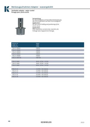 Werkzeugaufnahmen Adapter - wassergekühlt Toolholder adapter - water cooled Posage pour porte-outils Verwendung: Für die Aufnahme und korrekte Positionierung des Schrumpffutters auf dem Schrumpfgerät. Application: For the correct holding and positioning of the shrink chuck. Application: Pour la position correcte des mandrins de frettage dans l‘appareil de frettage. Bestell-Nr. Kegel Order no. Cone Référence Cône 750.21.HSK32 HSK32 750.21.HSK40 HSK40 750.21.HSK50 HSK50 750.21.HSK63 HSK63 750.21.HSK80 HSK80 750.21.HSK100 HSK100 750.21.SK30 SK30 | BT30 | CAT30 750.21.SK40 SK40 | BT40 | CAT40 750.21.SK50 SK50 | BT50 | CAT50 750.21.C3 C3 (PSK - ISO 26623) 750.21.C4 C4 (PSK - ISO 26623) 750.21.C5 C5 (PSK - ISO 26623) 750.21.C6 C6 (PSK - ISO 26623) 750.21.C8 C8 (PSK - ISO 26623) 46 2020