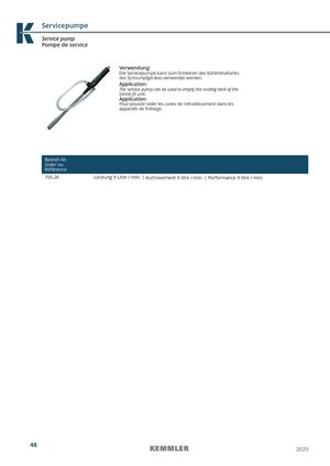 Servicepumpe Service pump Pompe de service Verwendung: Die Servicepumpe kann zum Entleeren des Kühlmitteltanks des Schrumpfgerätes verwendet werden. Application: The service pump can be used to empty the cooling tank of the shrink-fit unit. Application: Pour pouvoir vider les cuves de refroidissement dans les appareils de frettage. Bestell-Nr. Order no. Référence 705.26 Leistung 9 Liter / min. | Acchievement 9 litre / min. | Performance 9 litre / min. 48 2020