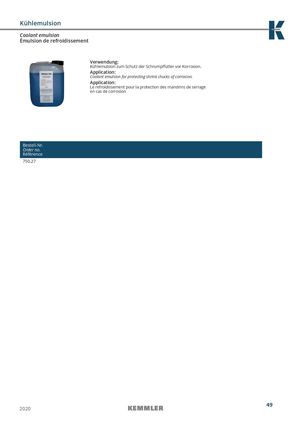 Kühlemulsion Coolant emulsion Émulsion de refroidissement Verwendung: Kühlemulsion zum Schutz der Schrumpffutter vor Korrosion. Application: Coolant emulsion for protecting shrink chucks of corrosion. Application: Le refroidissement pour la protection des mandrins de serrage en cas de corrosion Bestell-Nr. Order no. Référence 750.27 49 2020